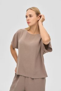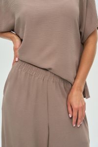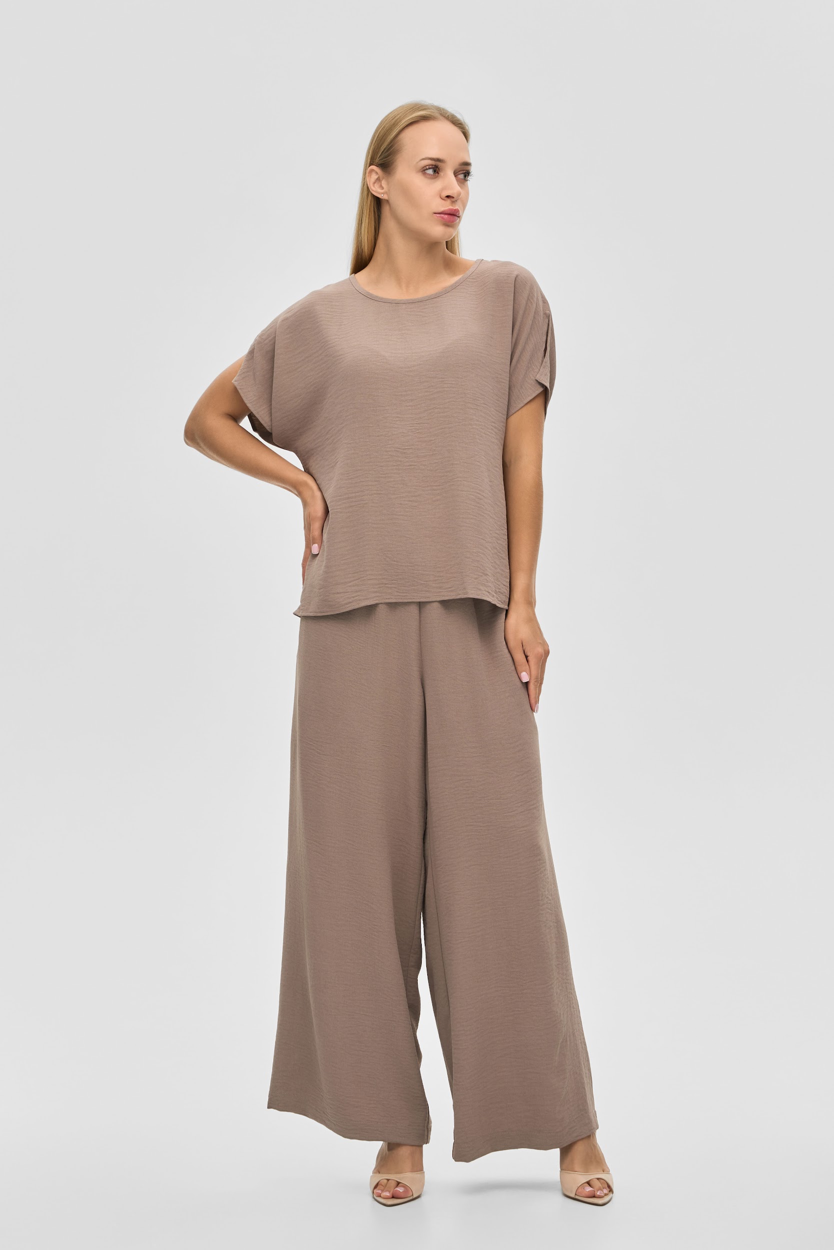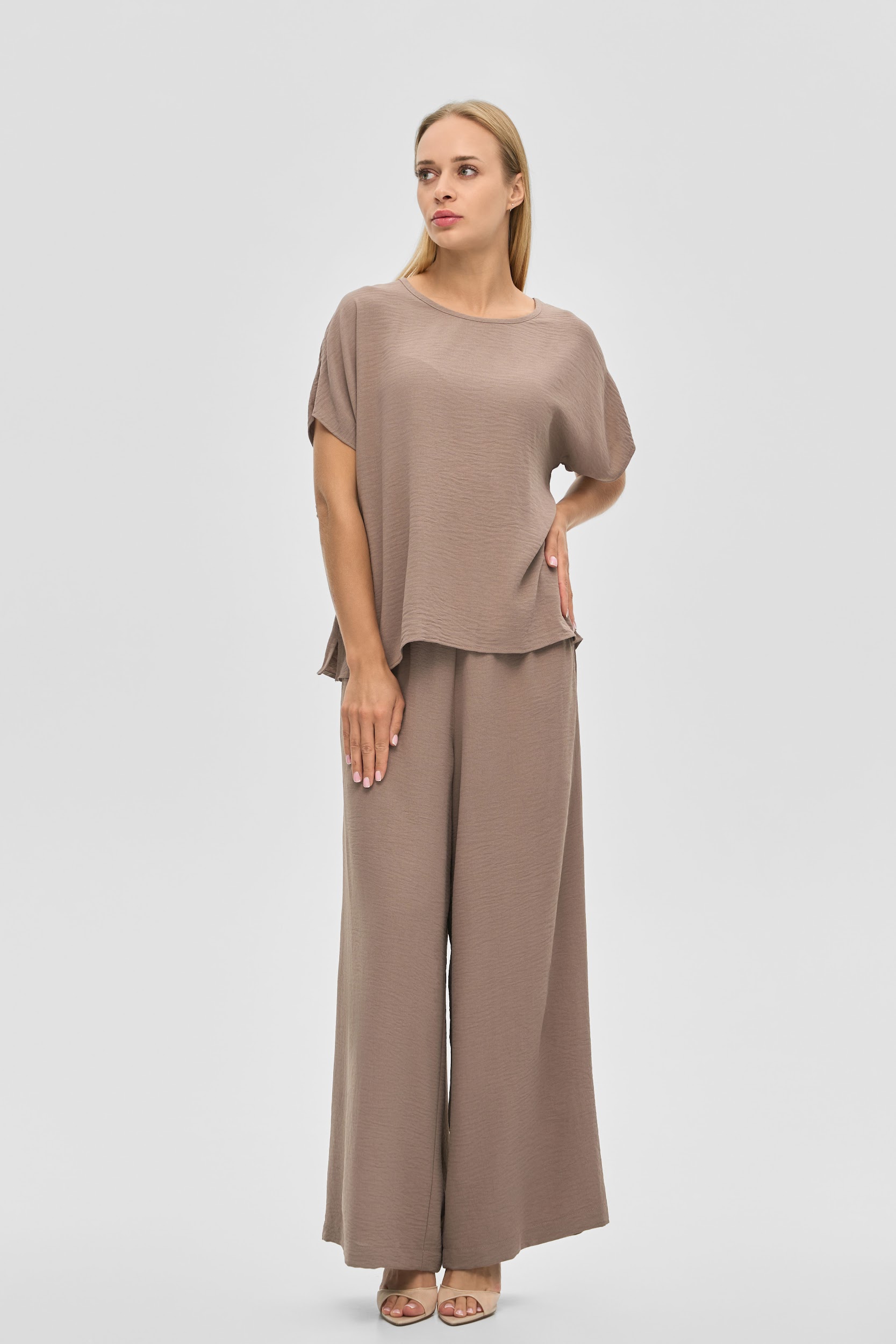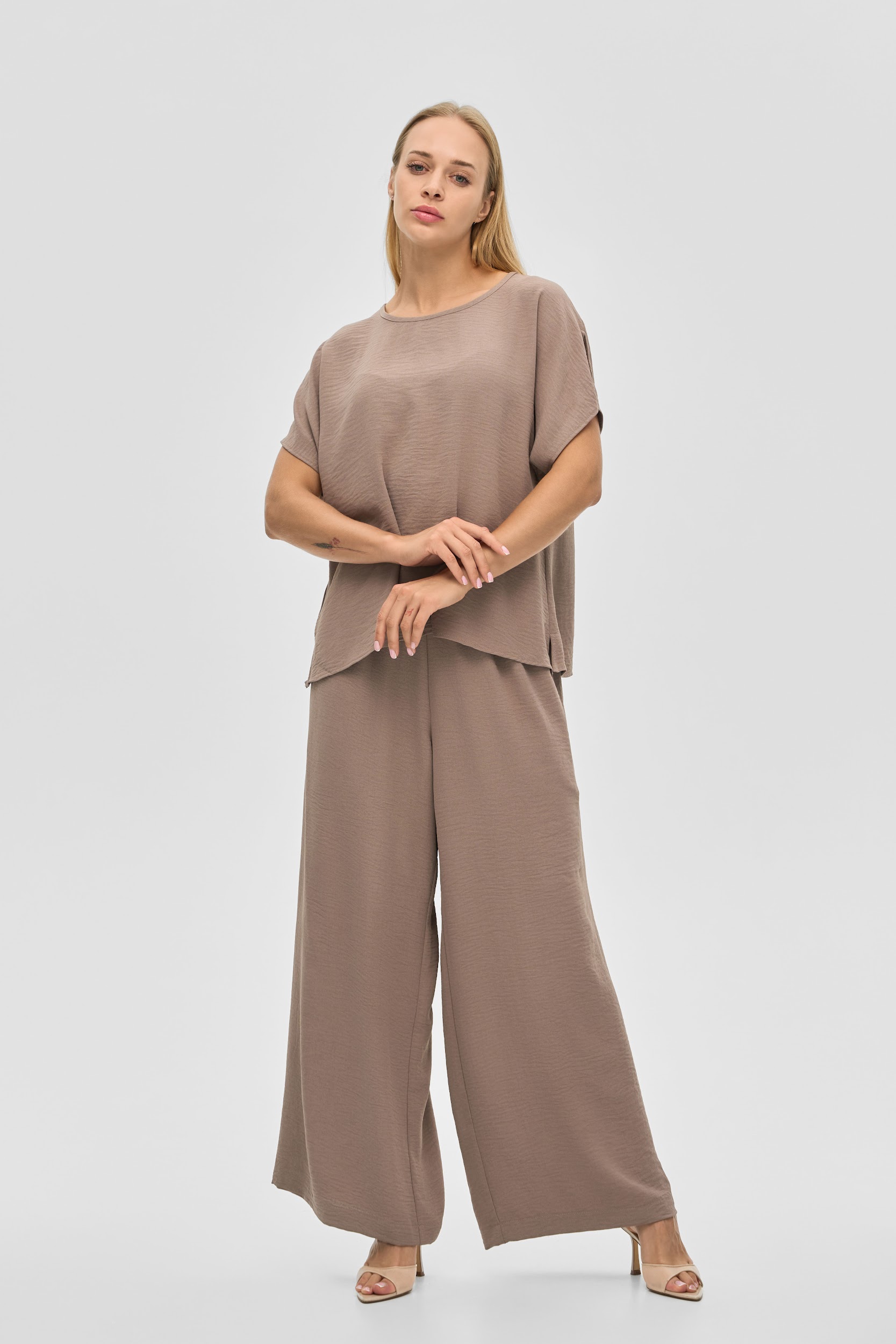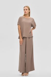 - Крій: Туніка вільного крою зі спущеною лінією плеча м’яко драпірується по фігурі, а широкі штани-палаццо на зручному еластичному поясі забезпечують ідеальну посадку та повну свободу.