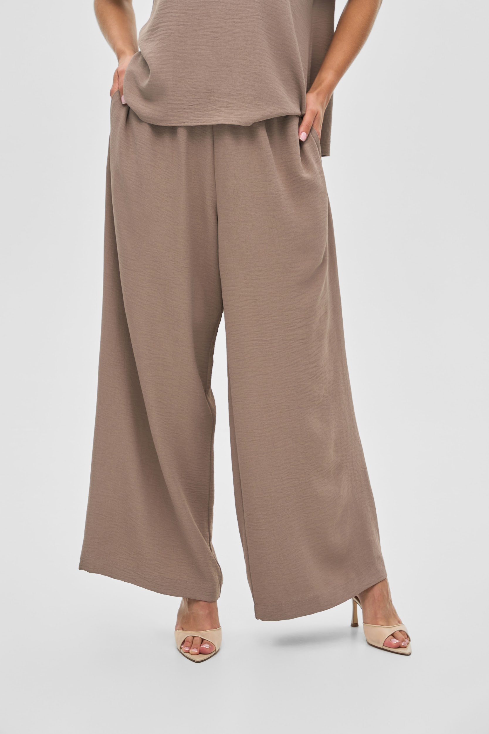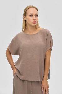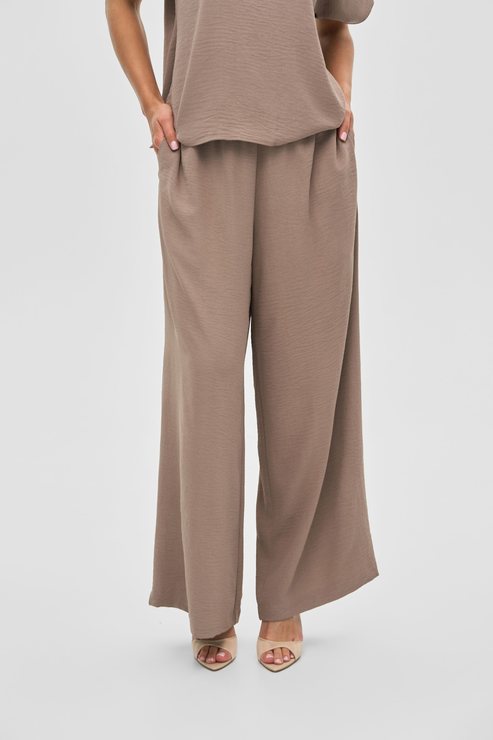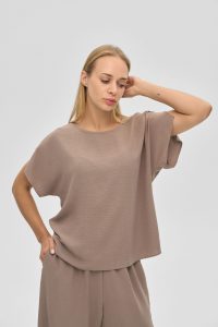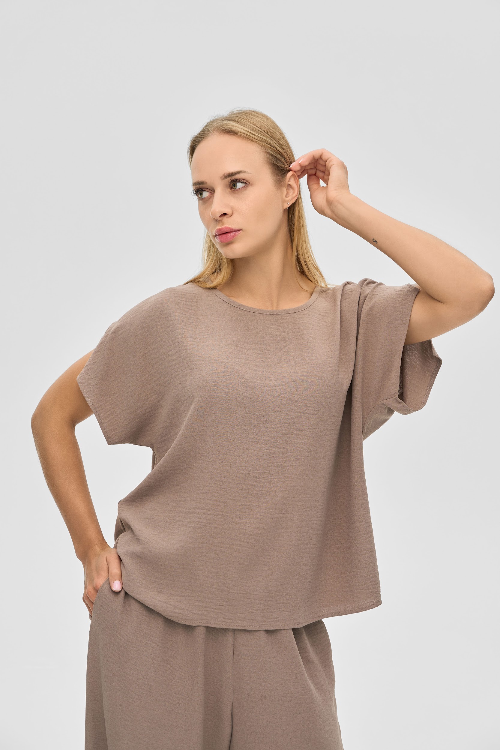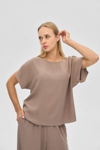 - Крій: Туніка вільного крою зі спущеною лінією плеча м’яко драпірується по фігурі, а широкі штани-палаццо на зручному еластичному поясі забезпечують ідеальну посадку та повну свободу.