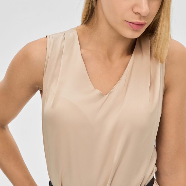 • Силует: Вільний прямий крій забезпечує комфортну посадку, а елегантний V-подібний виріз делікатно підкреслює шию та ключиці. М’які складки біля плечей створюють гарне драпірування на грудях, додаючи моделі витонченості.
