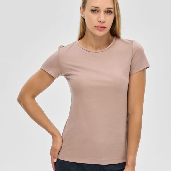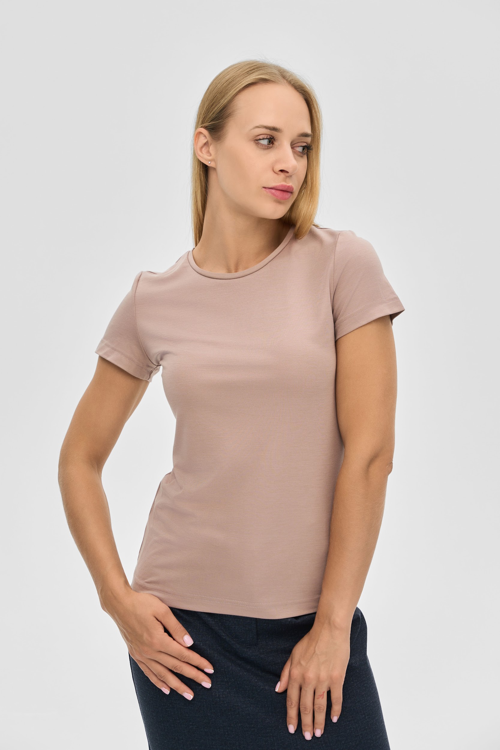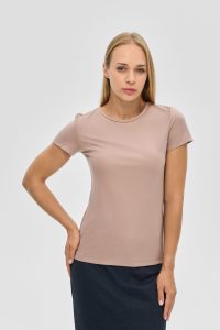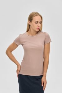 - Деталі: Класичний круглий виріз та короткий рукав правильної довжини — лаконічні деталі, що підкреслюють універсальність та позачасовий дизайн моделі.