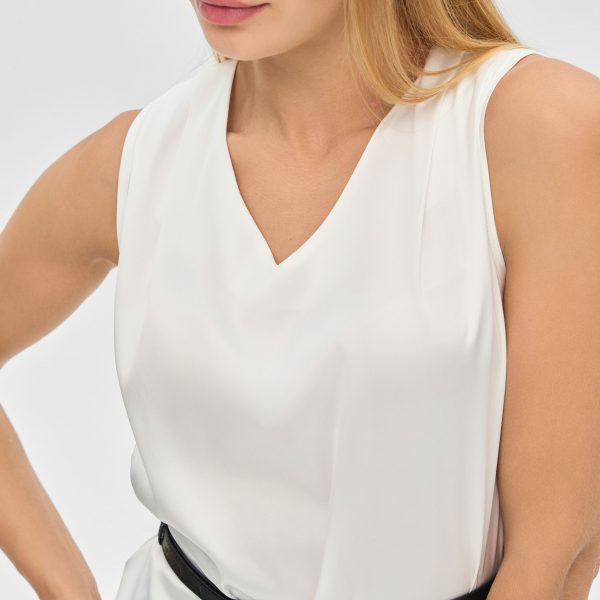 • Силует: Вільний прямий крій забезпечує комфортну посадку, а елегантний V-подібний виріз делікатно підкреслює шию та ключиці. М’які складки біля плечей створюють гарне драпірування на грудях, додаючи моделі витонченості.