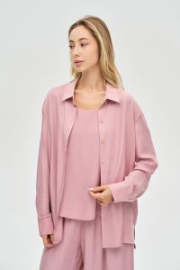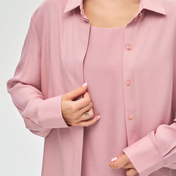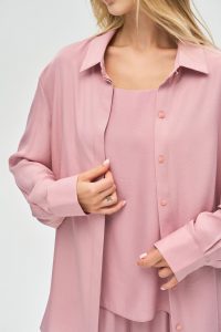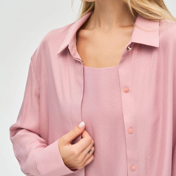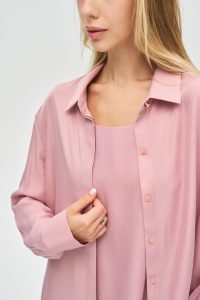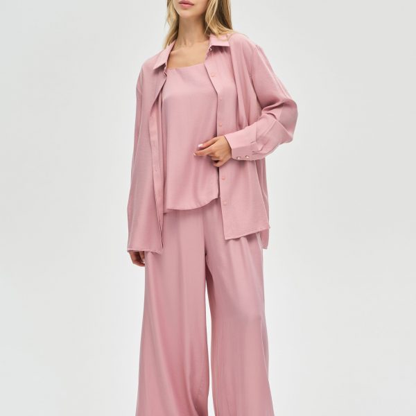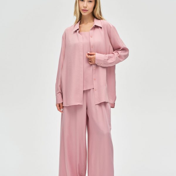 Зберіть ідеальний костюм: Ця сорочка є ідеальним доповненням до нашого костюма, що складається з топа та широких штанів з ідентичної тканини. Разом вони створюють розкішний та неймовірно стильний монохромний образ.