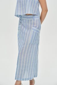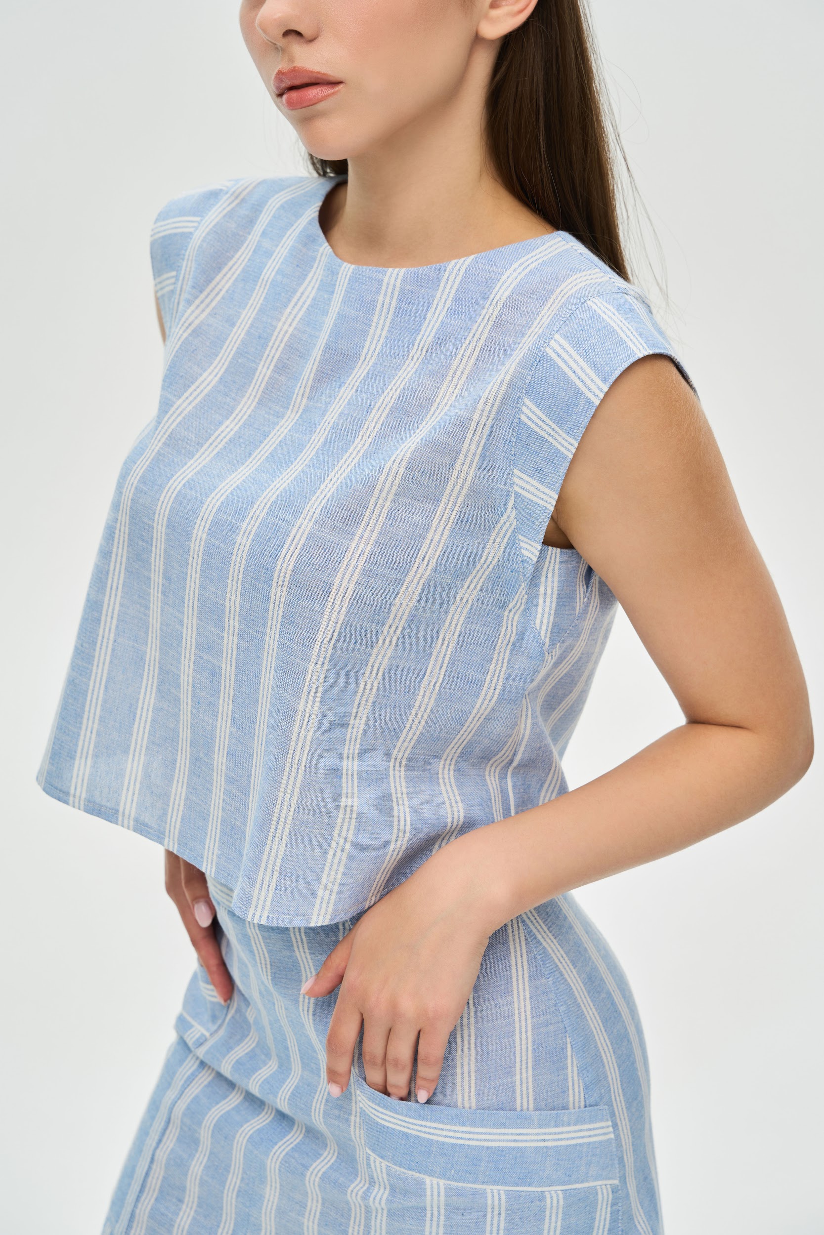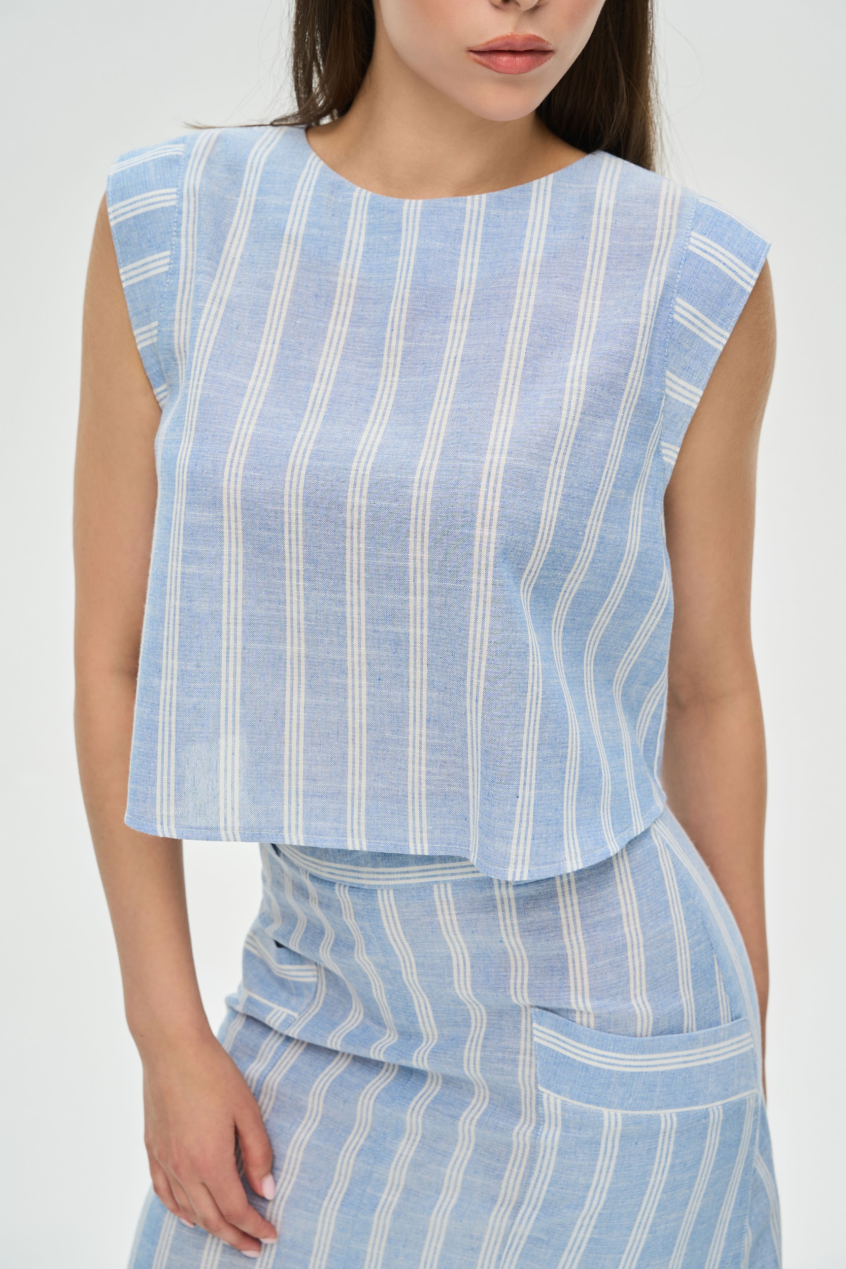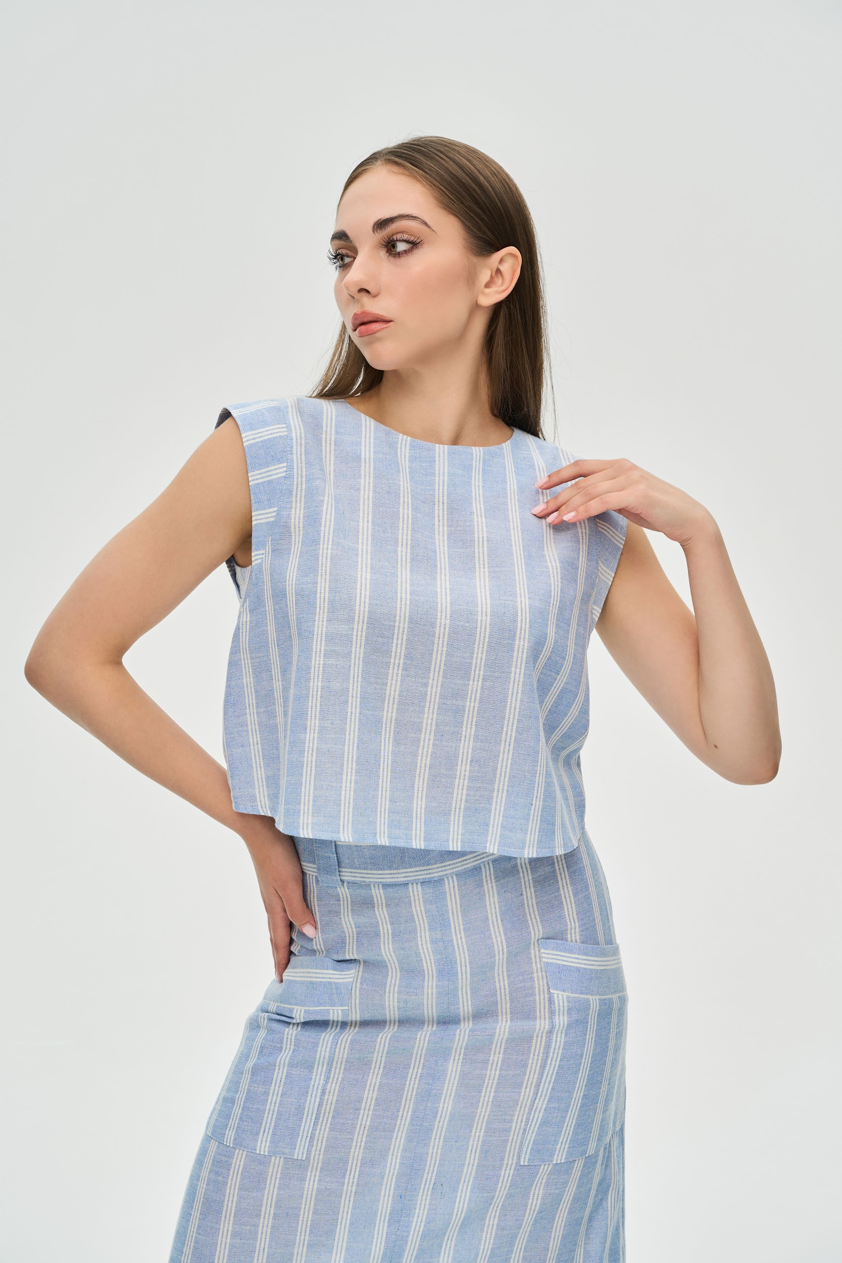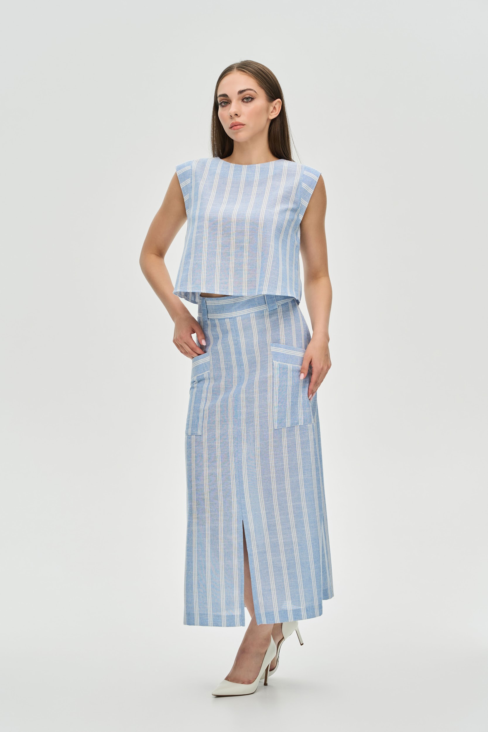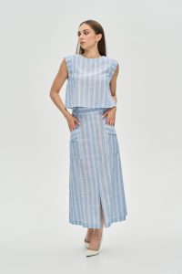 Костюм складається з двох самодостатніх елементів: вкороченого топа та спідниці-міді, які разом створюють гармонійний та завершений силует.