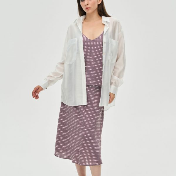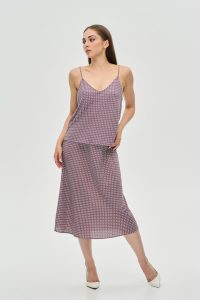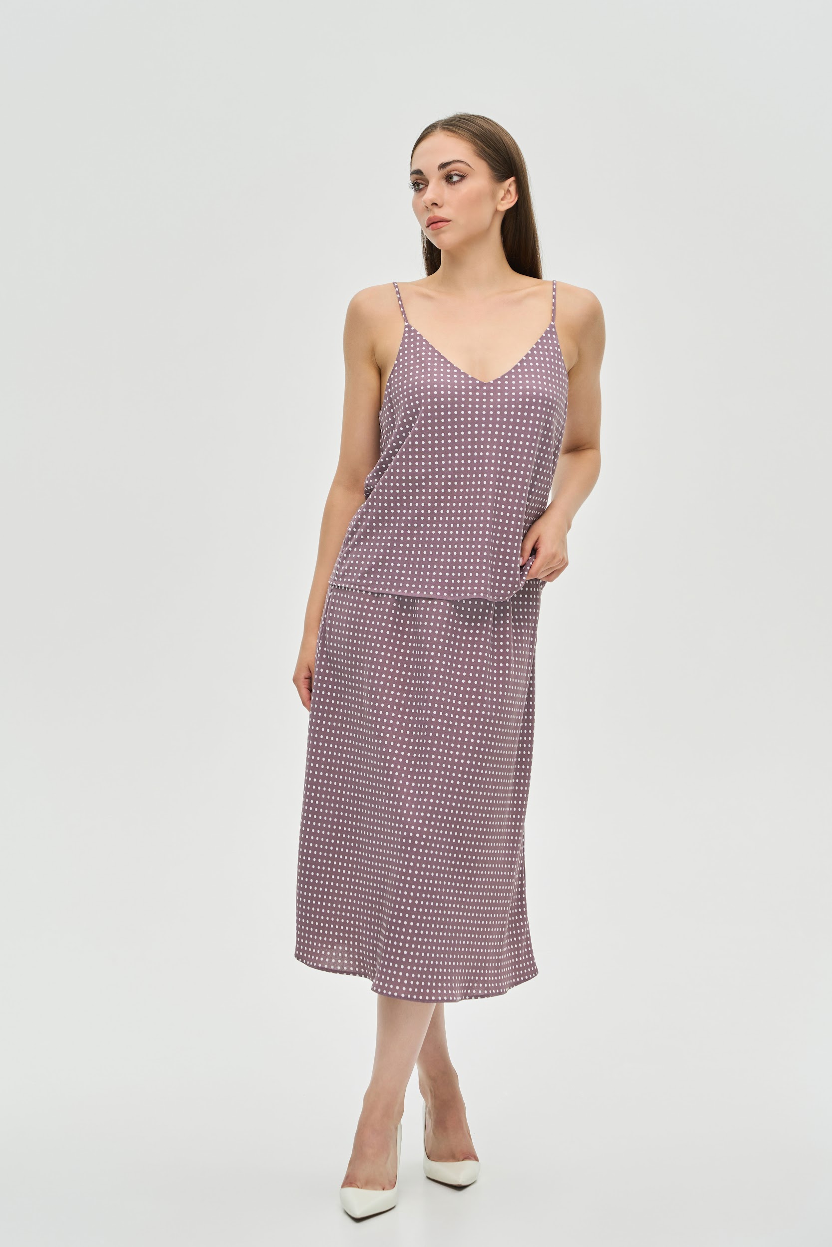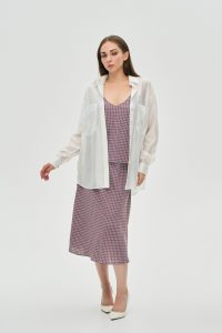 Модель виконана з високоякісної шовковистої тканини, що має делікатний, благородний атласний блиск. Вона неймовірно приємна до тіла, легко драпірується та дарує відчуття прохолоди, що робить її ідеальною для будь-якого сезону.