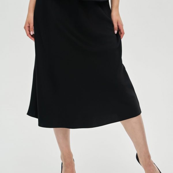 Спідниця має ідеальну довжину міді та А-подібний силует, що м’яко спадає та створює граційний, летючий рух при ходьбі. Тканина з делікатним атласним блиском виглядає вишукано та елегантно.