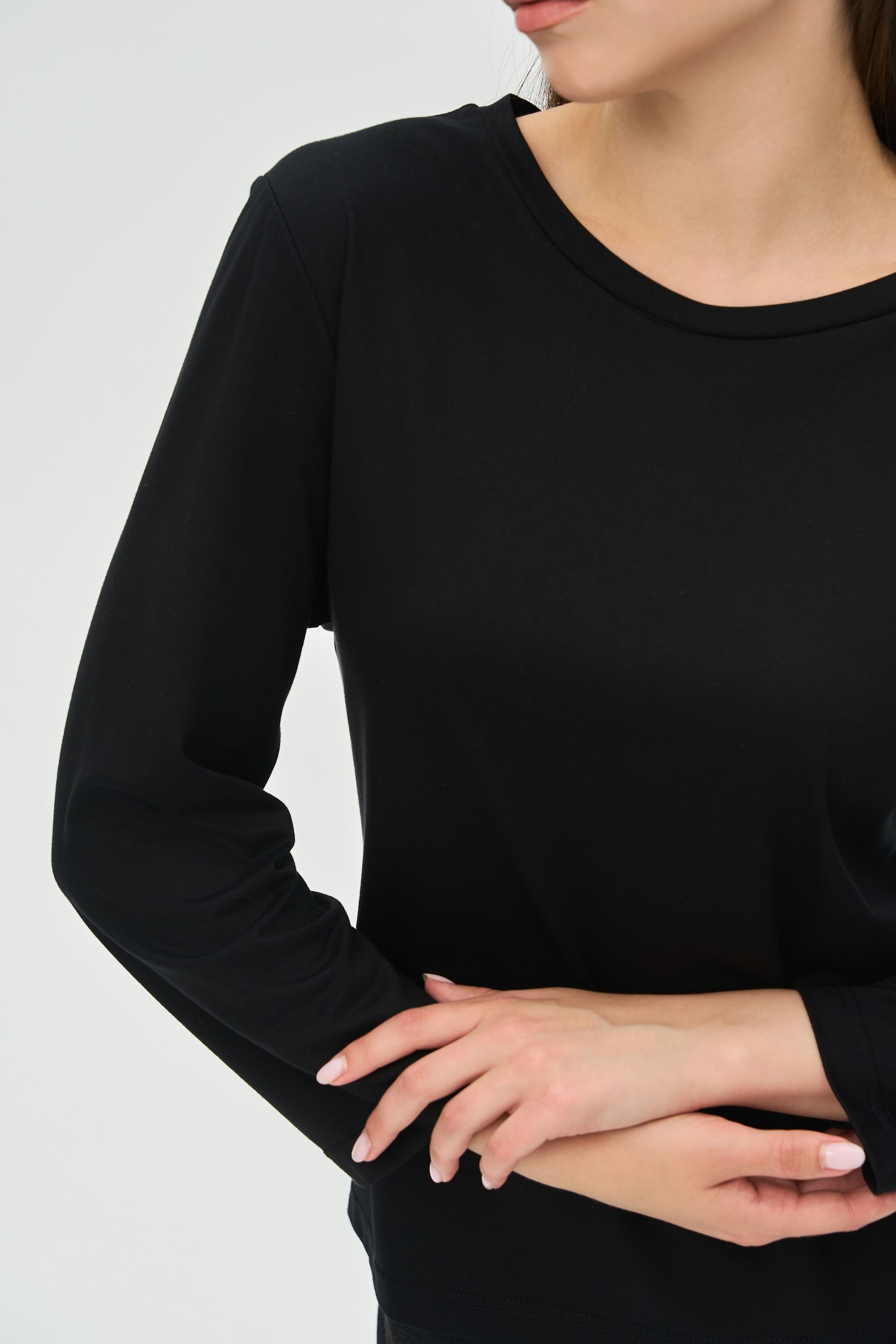• Крій: Класичний напівприталений крій ідеально сідає по фігурі, не обтягуючи її та не створюючи зайвого об’єму. Це робить його ідеальним першим шаром під жакети, светри чи сорочки.