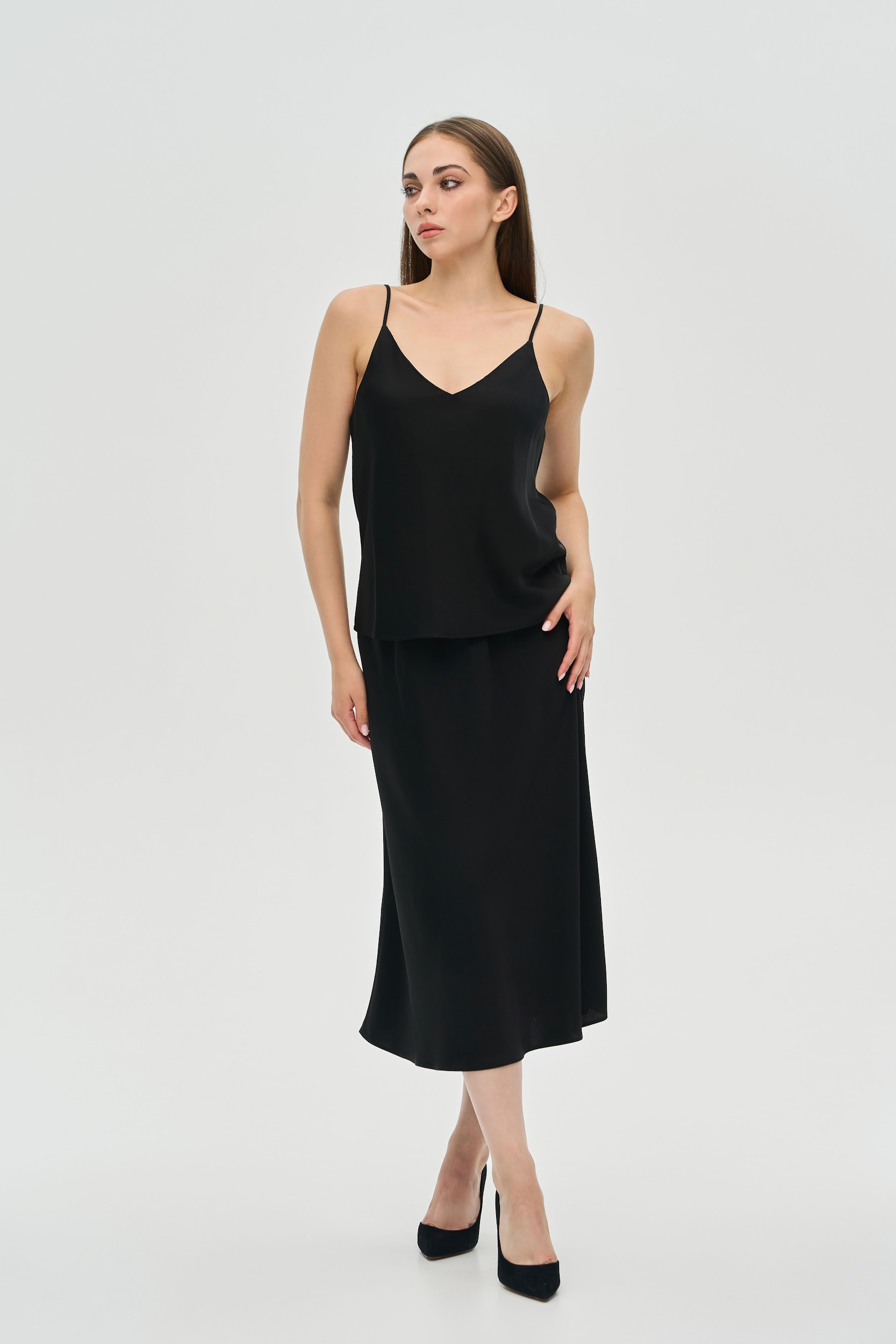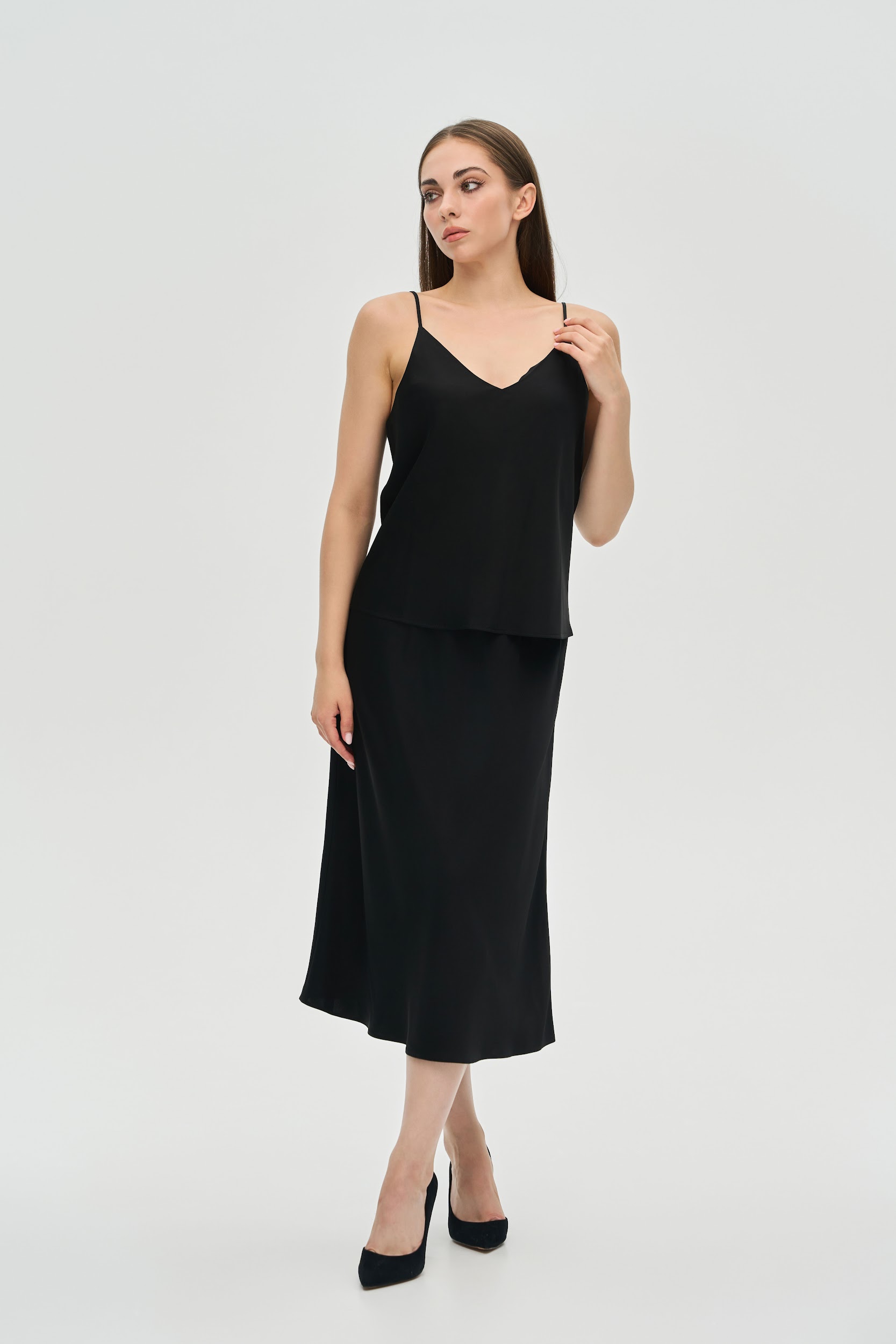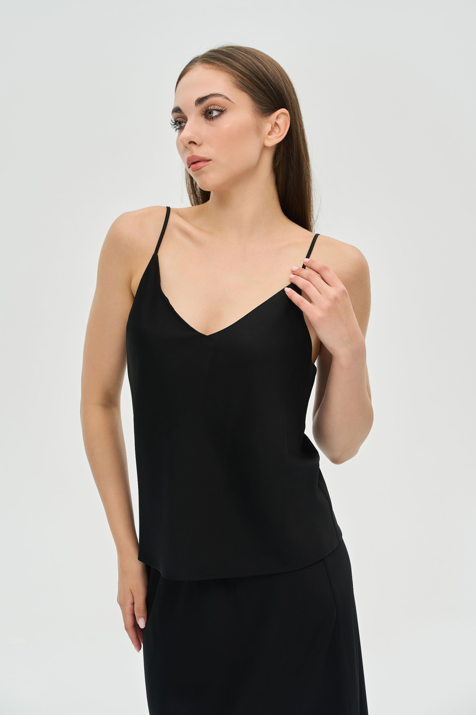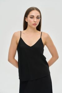 Елегантність у простоті. Цей базовий топ на тонких бретелях — незамінна річ у гардеробі сучасної жінки. Він стане ідеальною основою для десятків образів: від стриманих ділових до розкішних вечірніх.