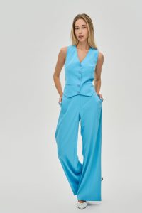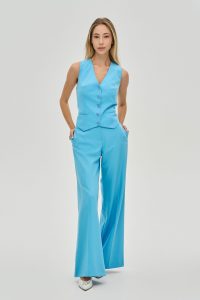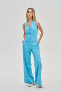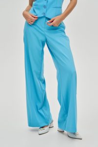 Втілення грації та свободи у русі. Ці розкішні брюки-палаццо у насиченому блакитному відтінку створені, щоб дарувати вам відчуття легкості та впевненості. Їхній летючий силует та яскравий колір роблять їх самодостатнім елементом будь-якого гардероба.