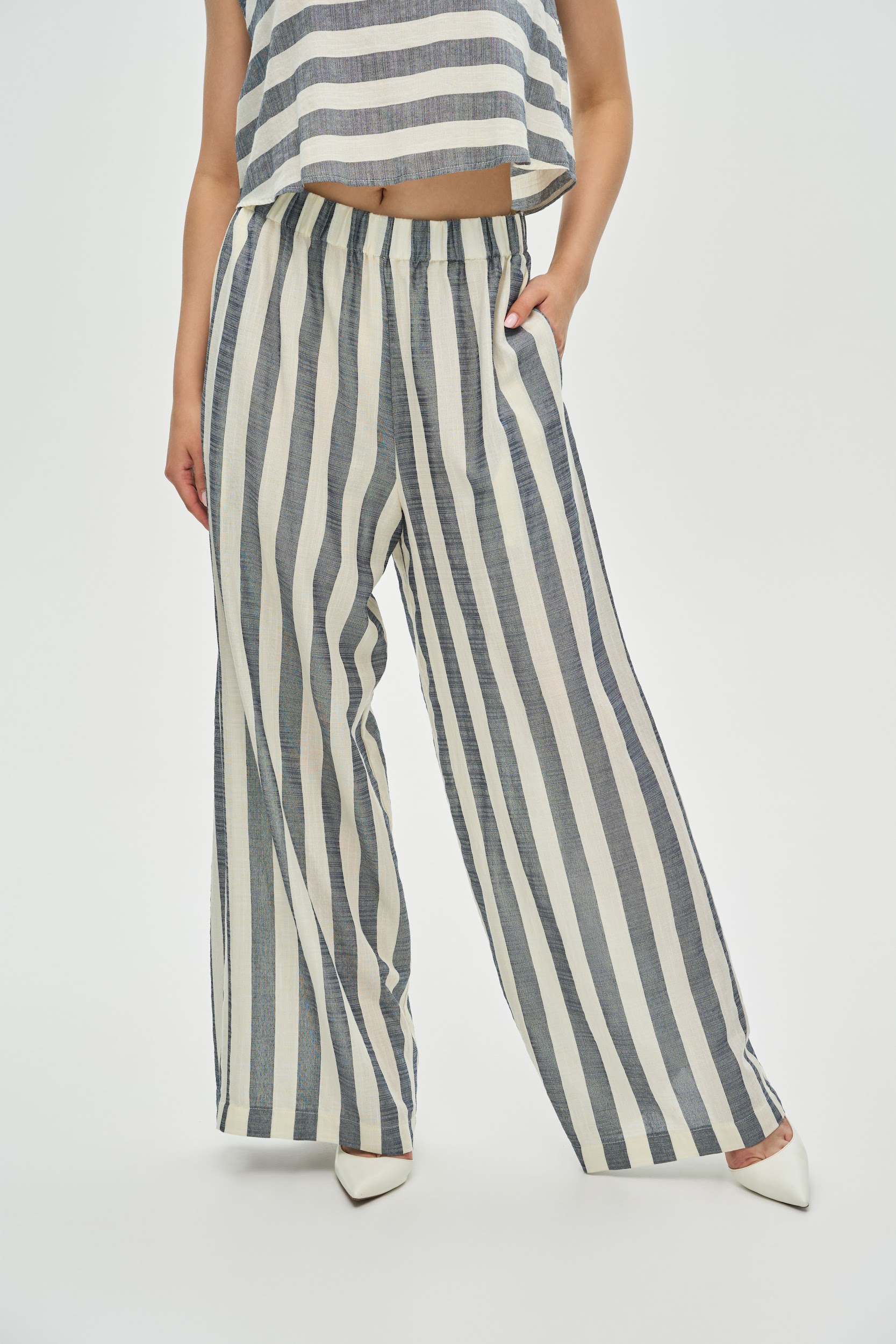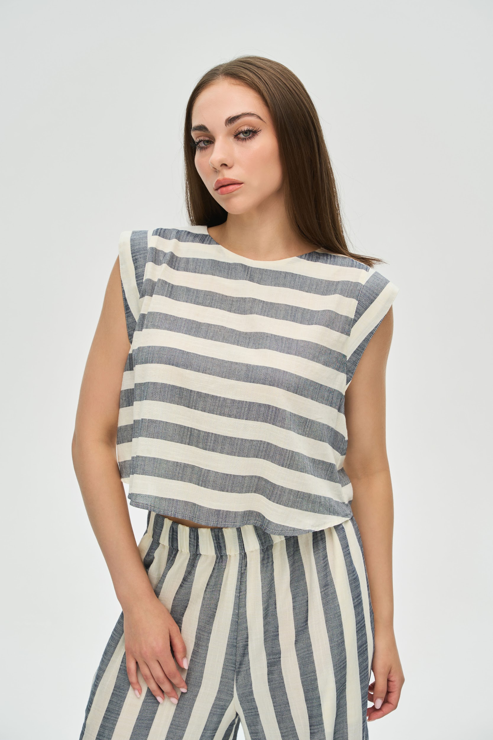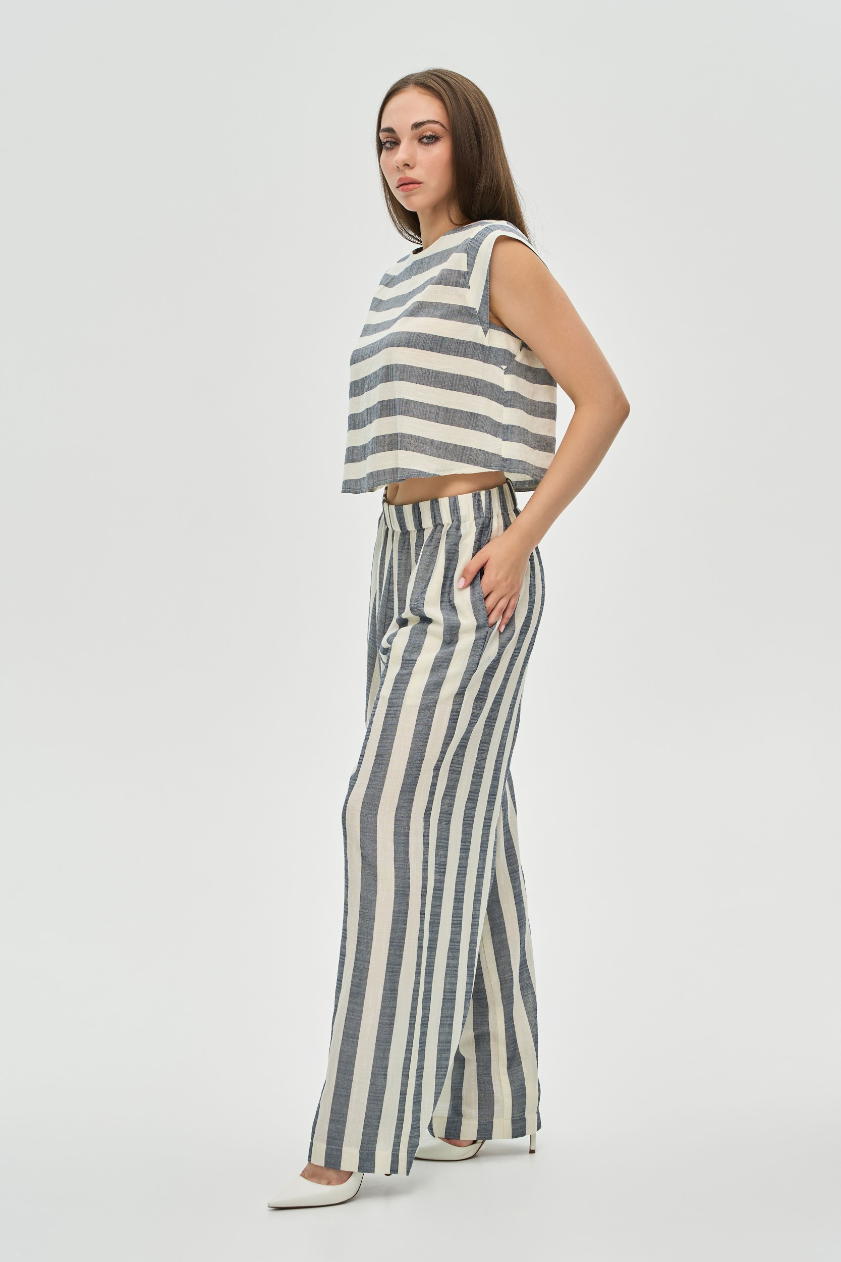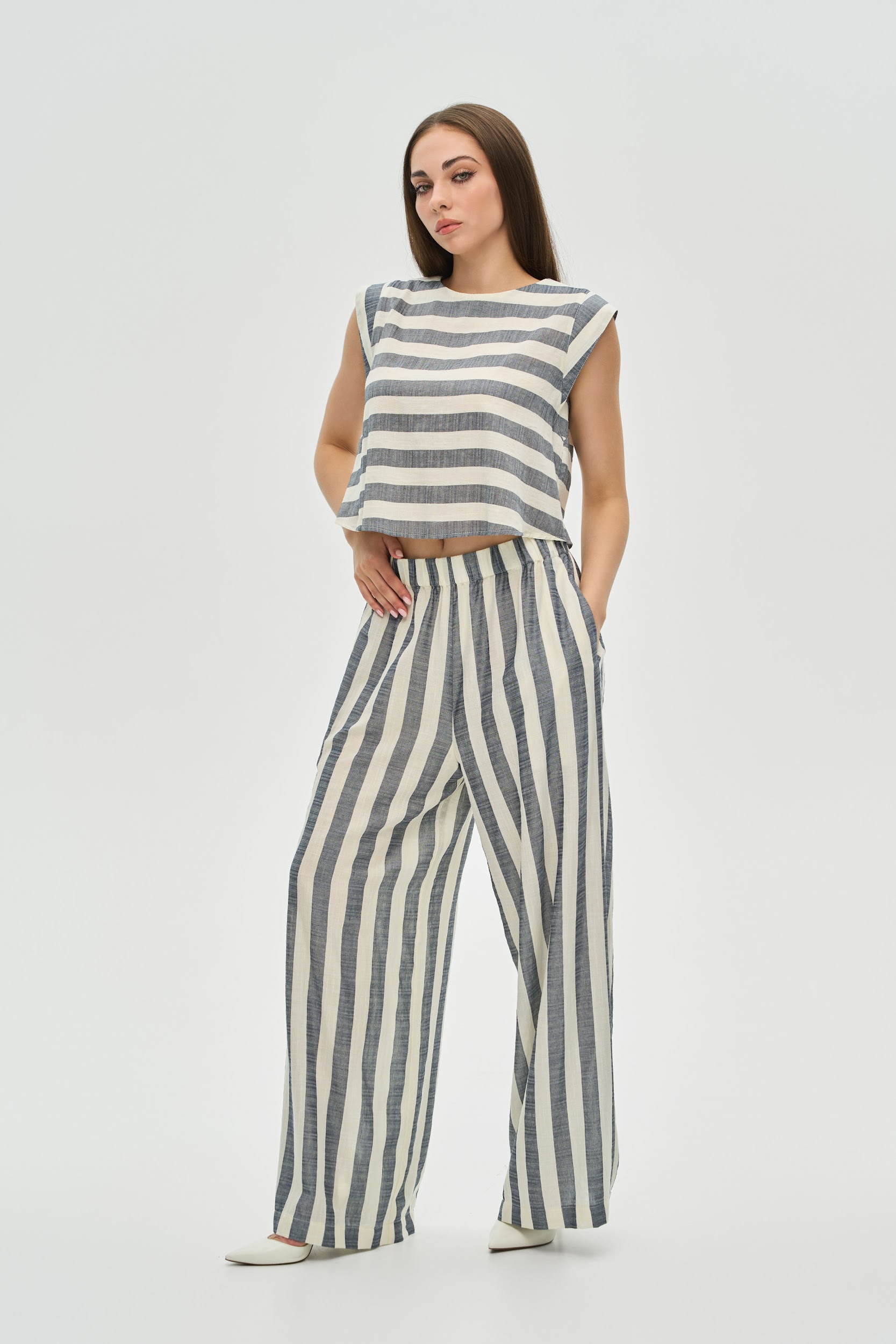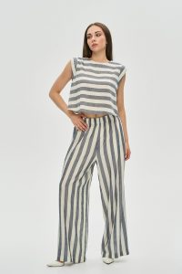 - Крій: Комплект складається з вільного вкороченого топа з чіткою лінією плеча та широких штанів-палаццо на зручному еластичному поясі. Практичні кишені у бічних швах додають функціональності.