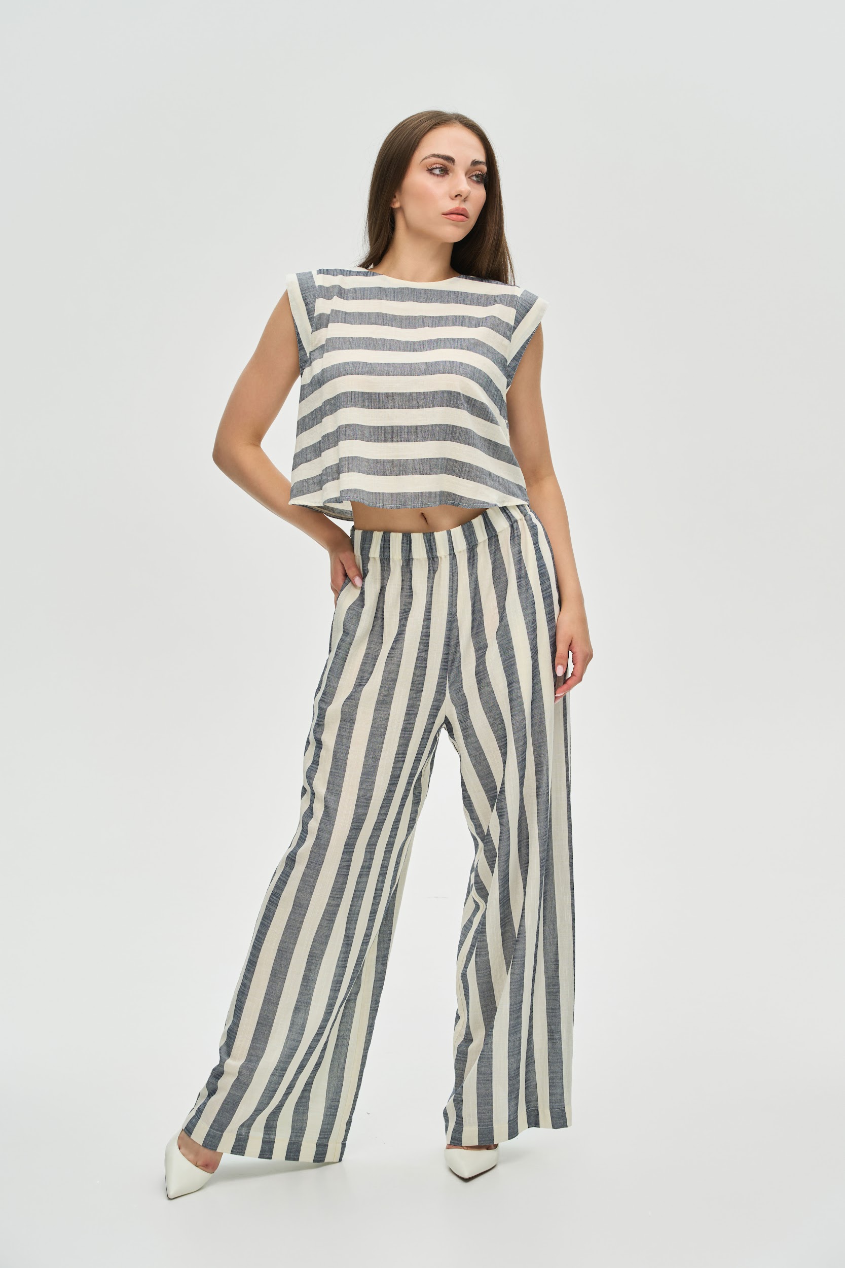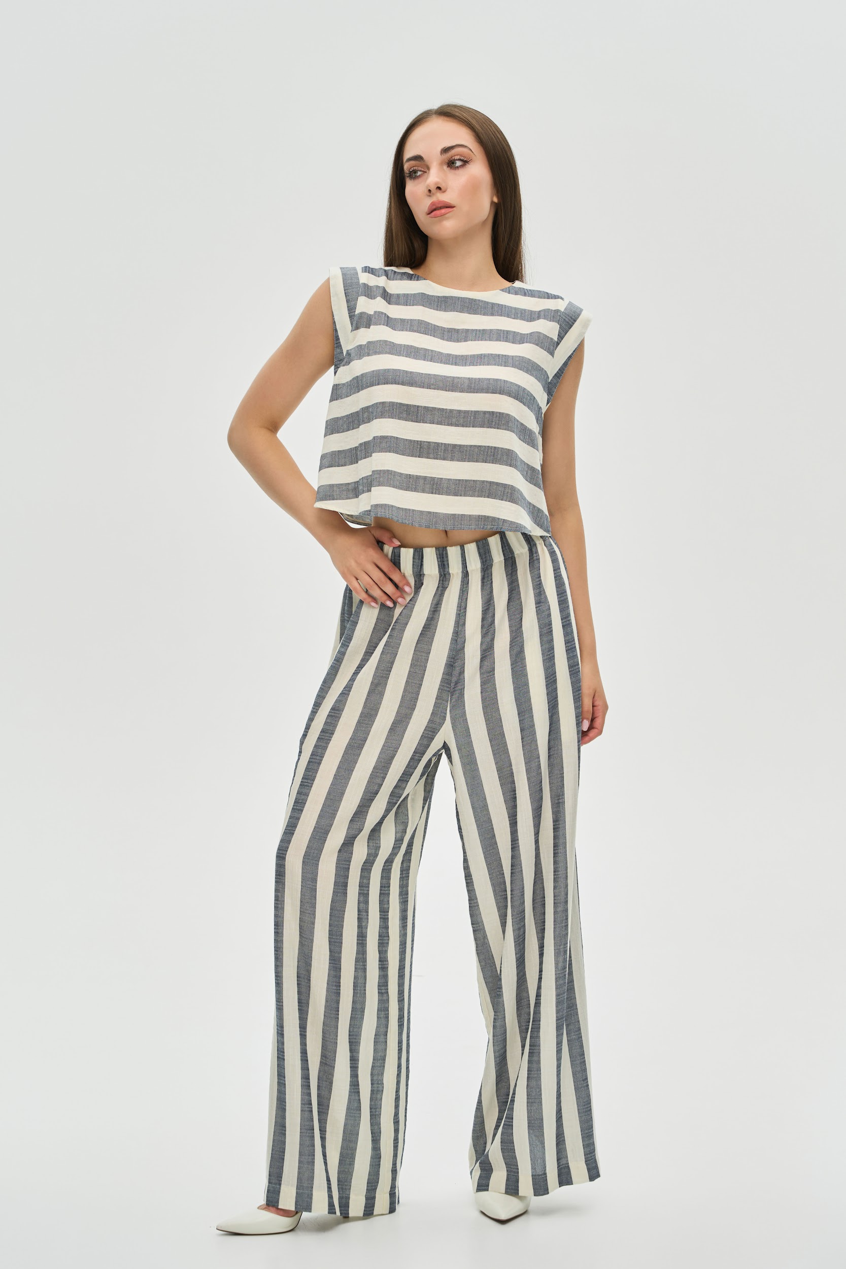 - Дизайн: Вертикальні смуги на штанах візуально видовжують ноги та роблять фігуру стрункішою, тоді як горизонтальні на топі врівноважують силует.