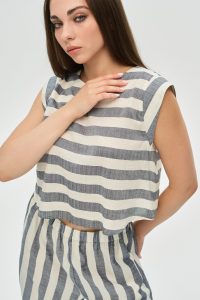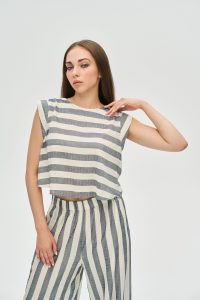 - Універсальність: Цей костюм є ідеальною капсулою: носіть його разом для створення ефектного total look, або поєднуйте топ з однотонними шортами чи спідницею, а штани — з базовою футболкою.