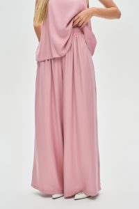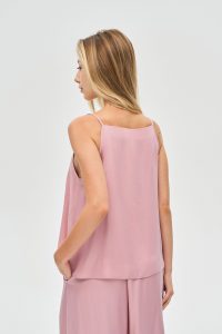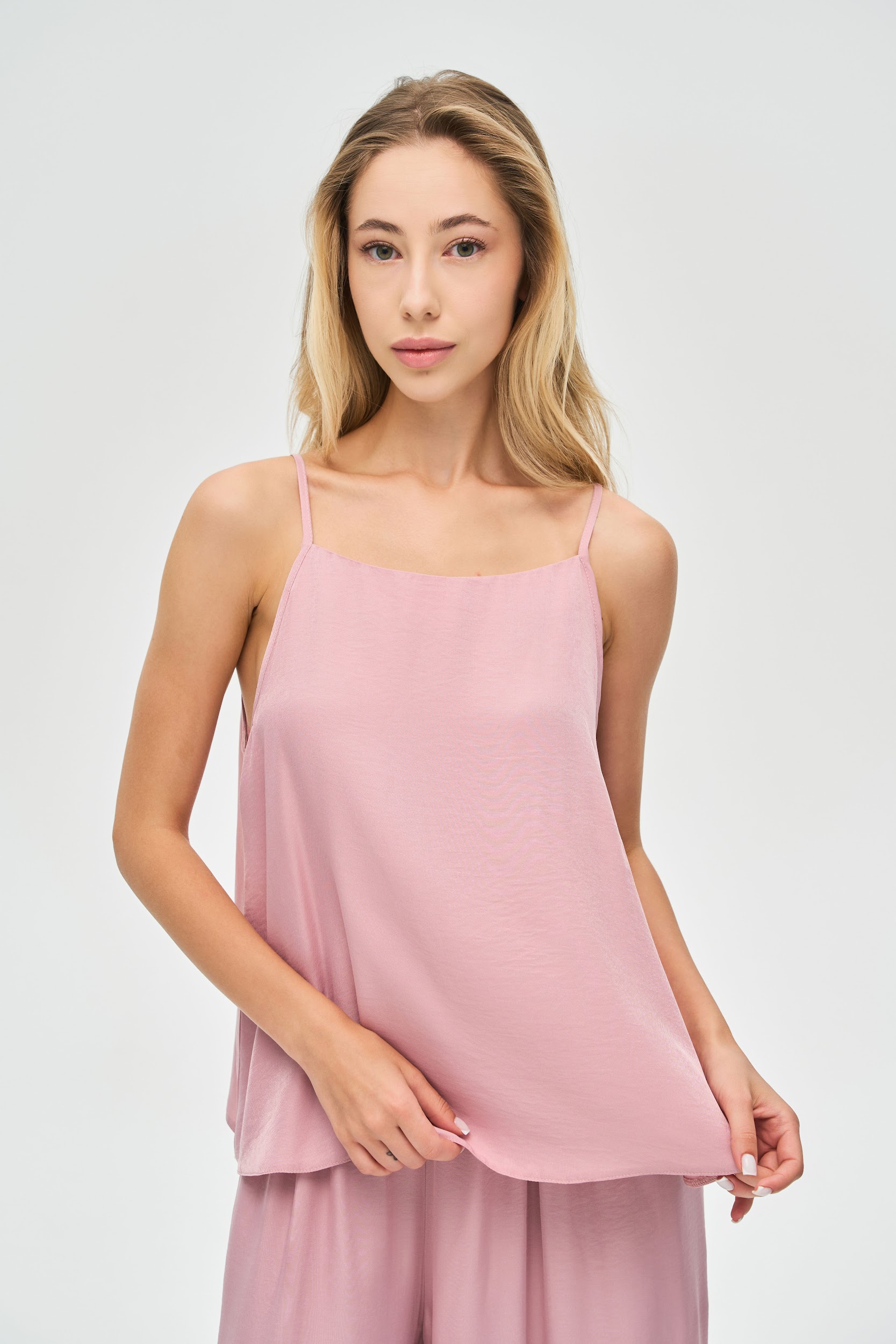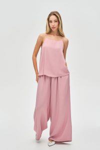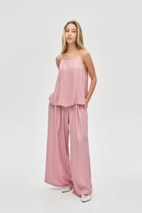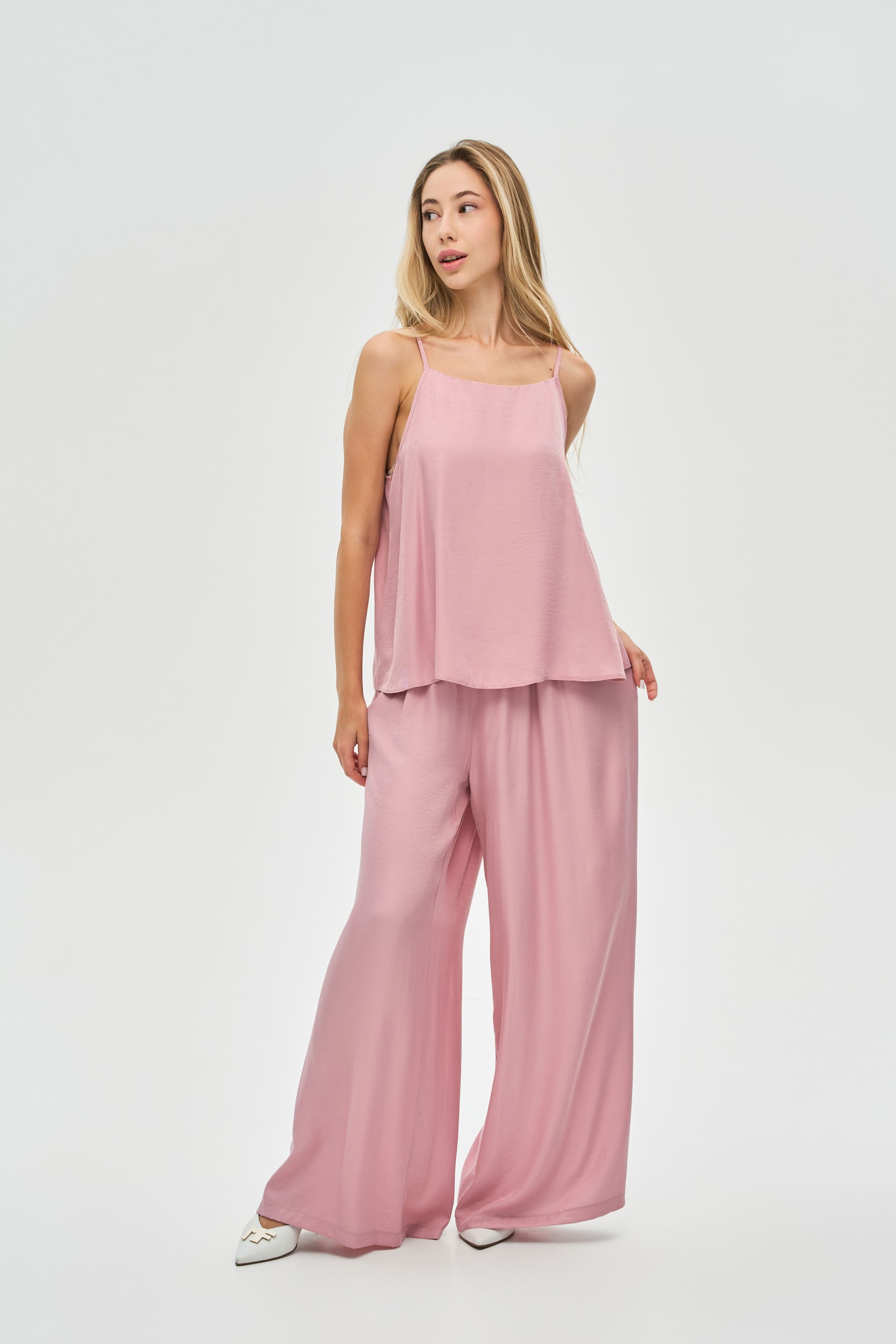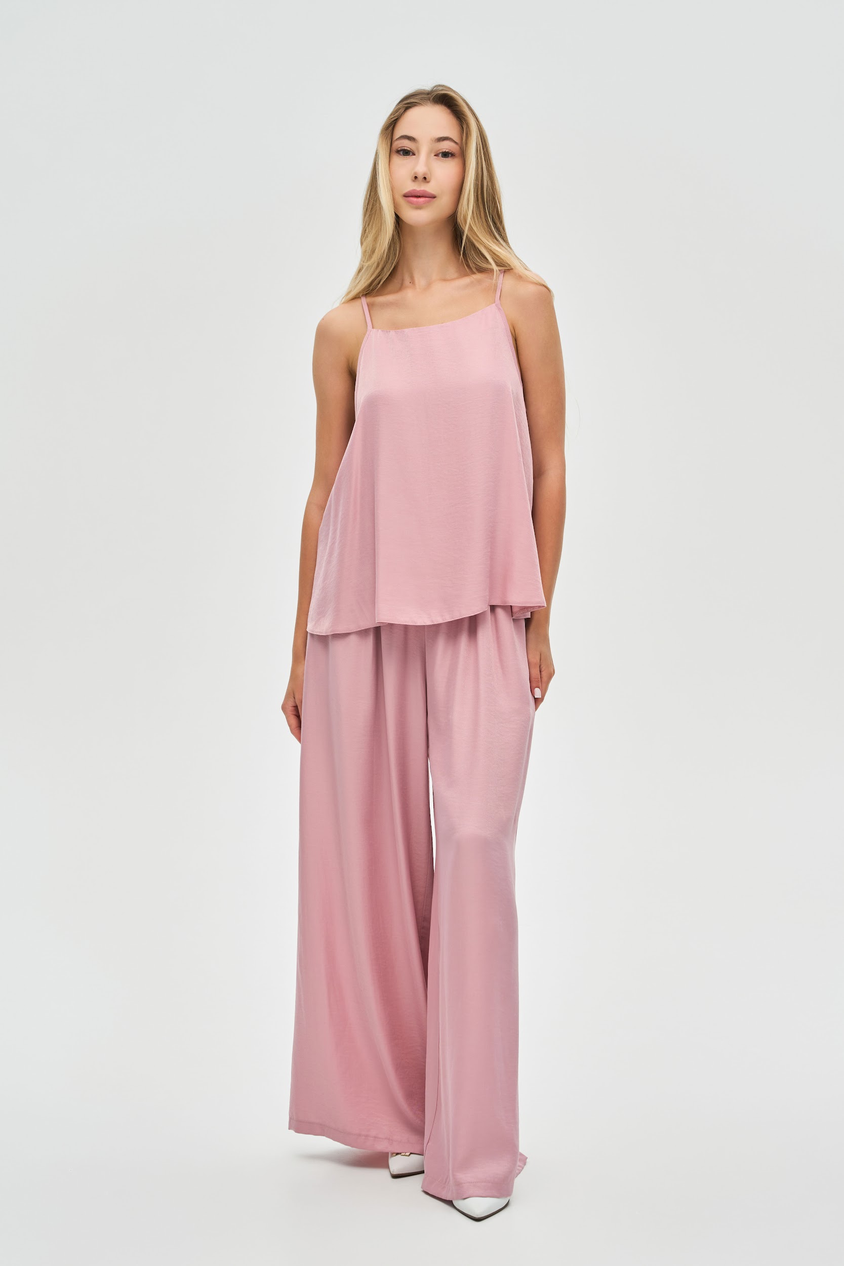 - Комплектація: Костюм складається з двох елементів — широких штанів-палаццо та топа вільного крою на тонких регульованих бретелях.
