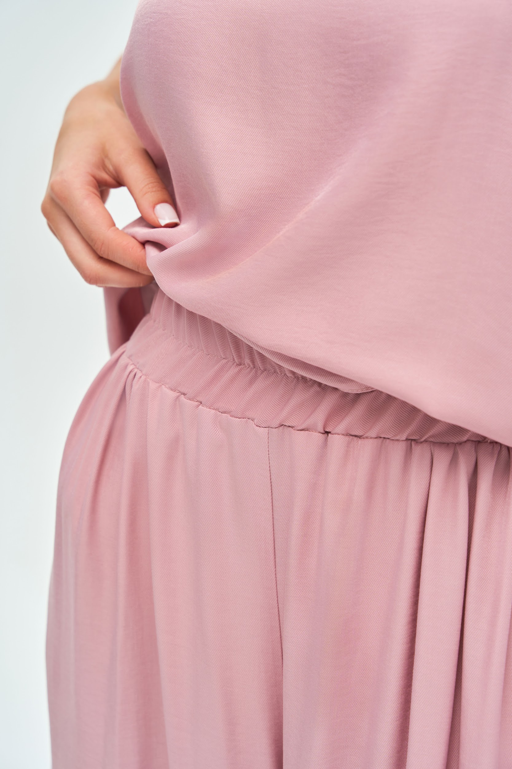 Поєднання вільного крою та легкої, шовковистої тканини дарує неймовірне відчуття свободи та легкості. Костюм м’яко струмує по тілу, не сковуючи рухів, та створює витончений, летючий силует.