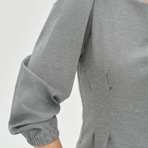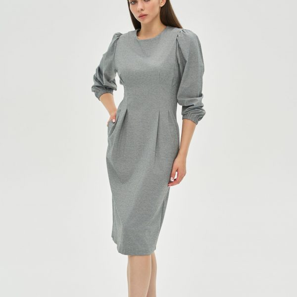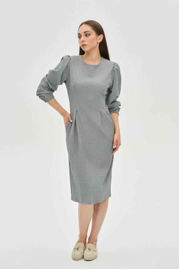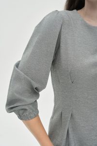 Ця модель середньої довжини вирізняється елегантним кроєм, що делікатно окреслює силует. Особливого шарму додають м’які складки на поясі, які створюють витончений акцент на талії, та на плечах, що формують легкий об’єм рукава, додаючи образу романтичності.