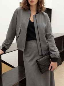 Бомбер: Стильна альтернатива жакету. Має контрастні чорні еластичні манжети та комір, зручну застібку на блискавку та акцентні накладні кишені з клапанами, що додають образу динаміки.