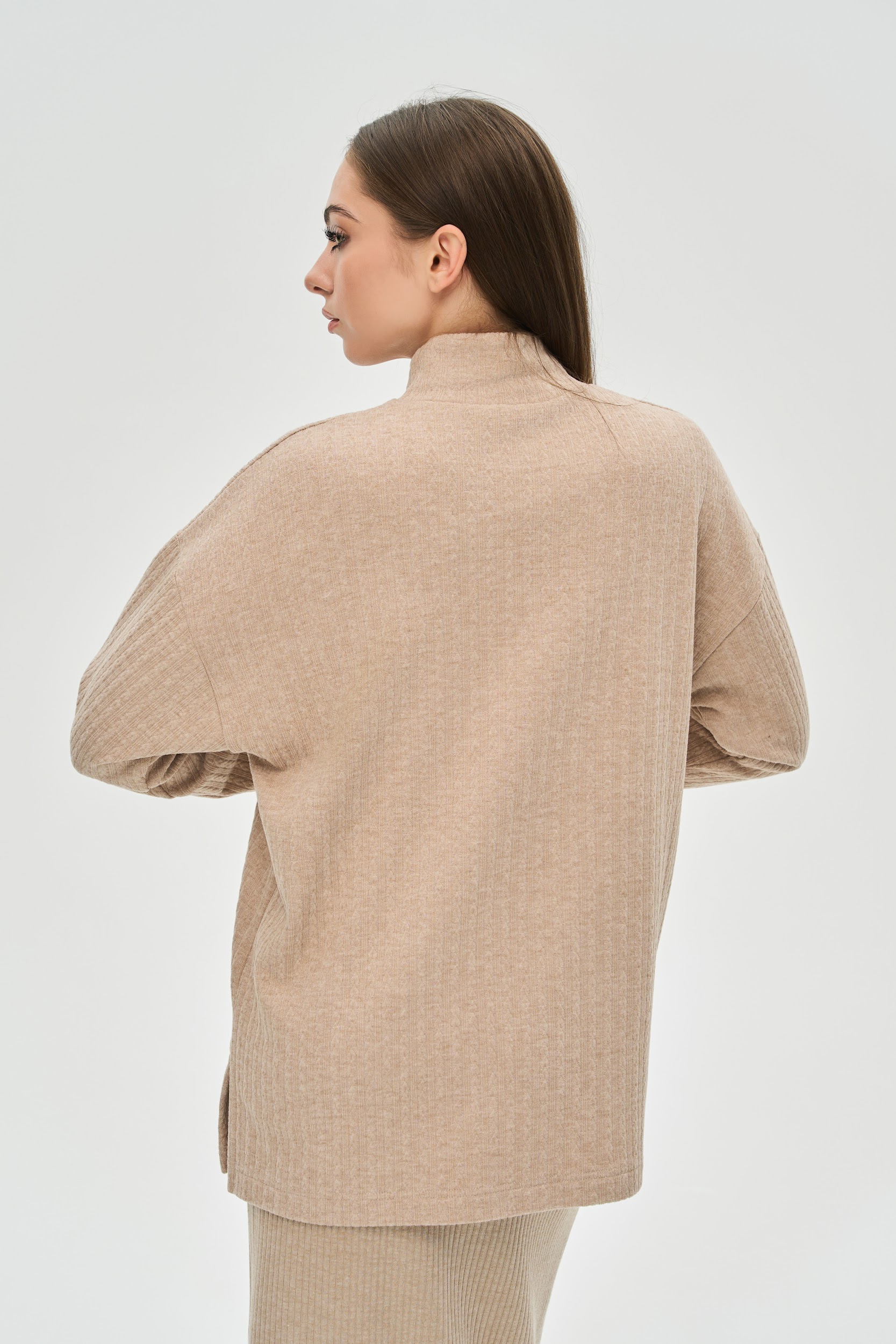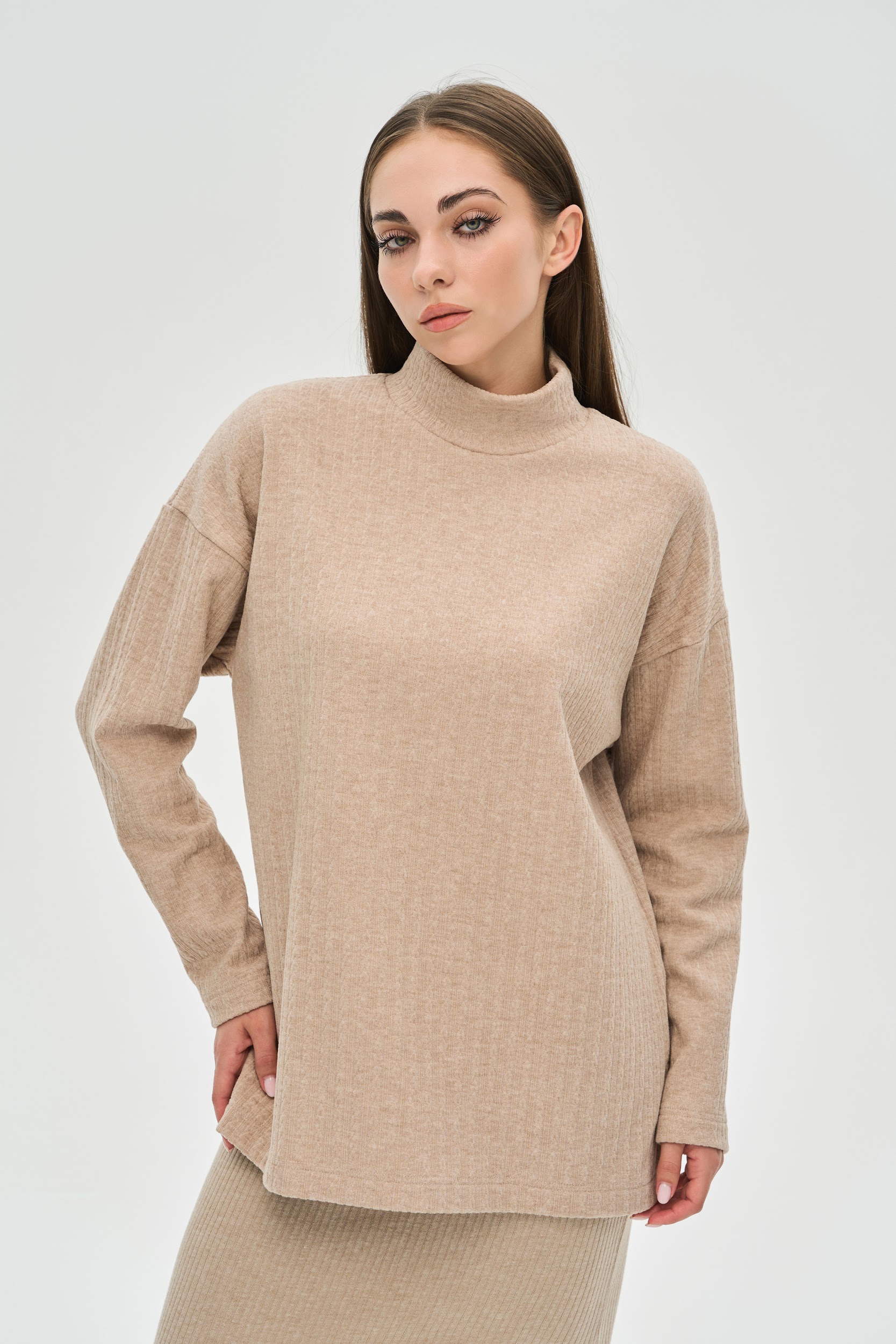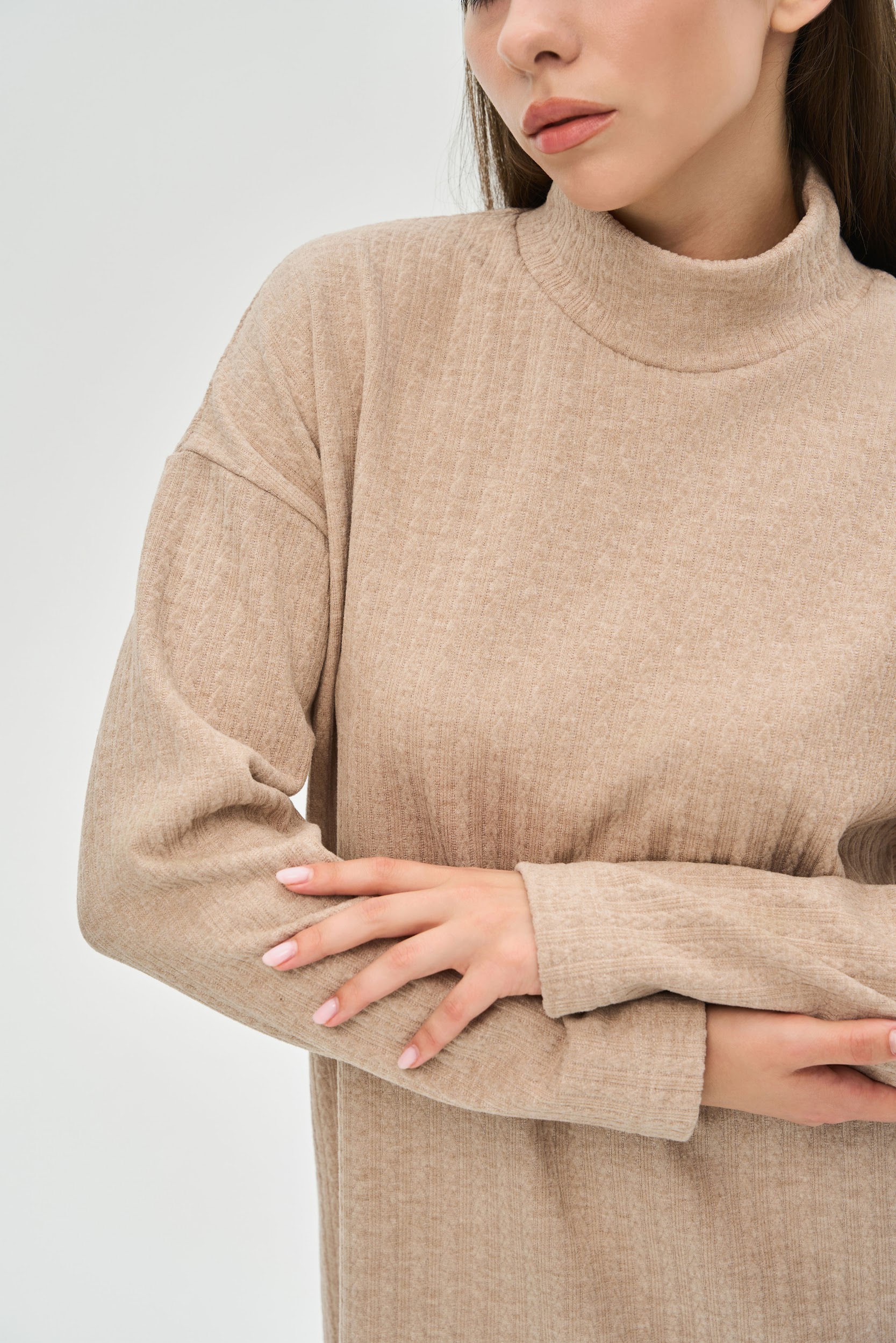 - Ткань: Выполнен из мягкого, приятного к телу трикотажа с деликатной вертикальной фактурой. Он хорошо сохраняет тепло, позволяет коже дышать и не сковывает движений.