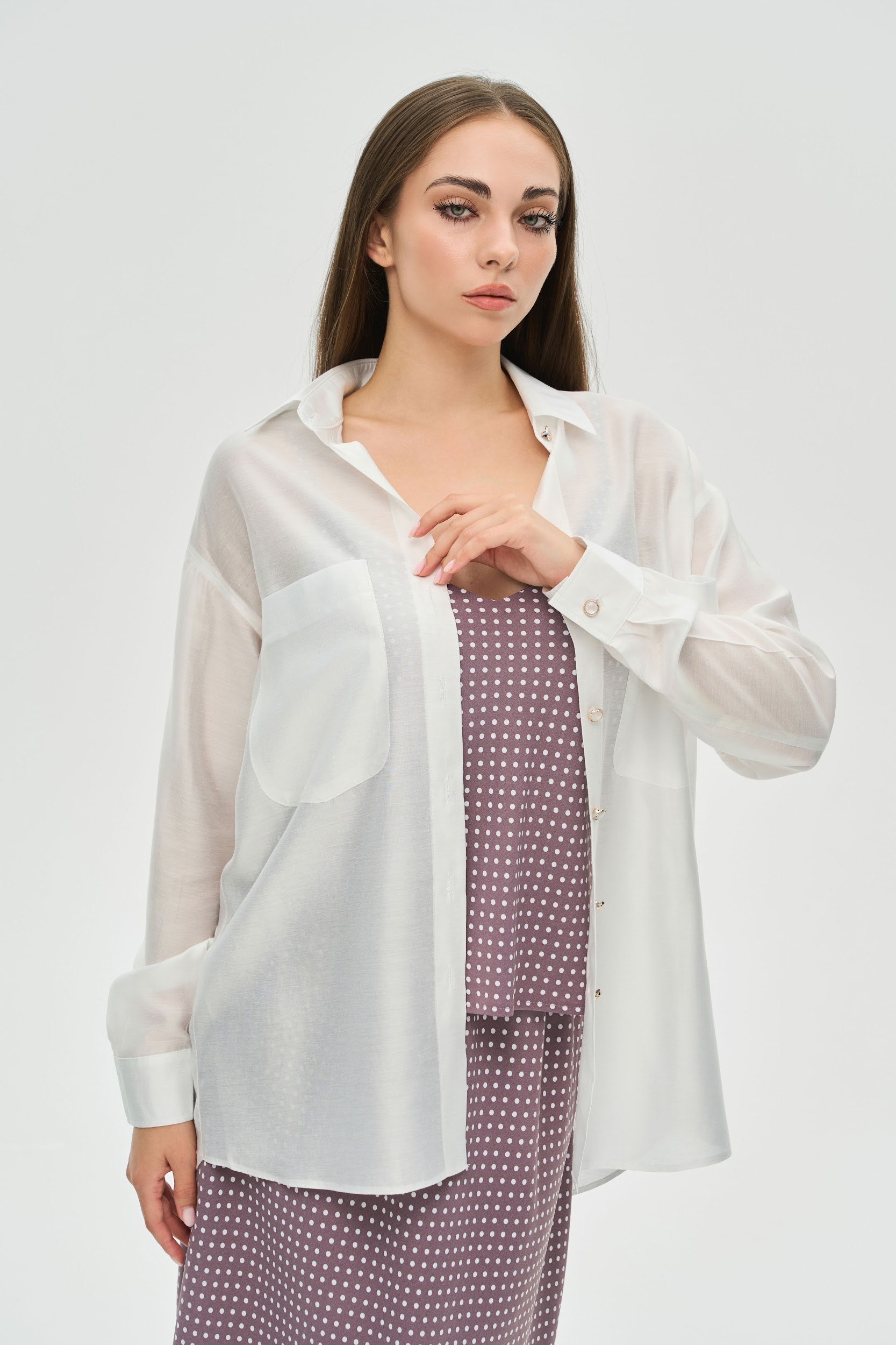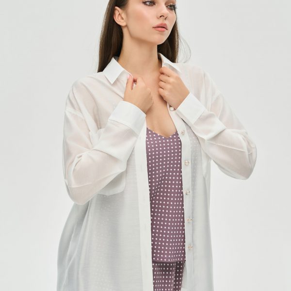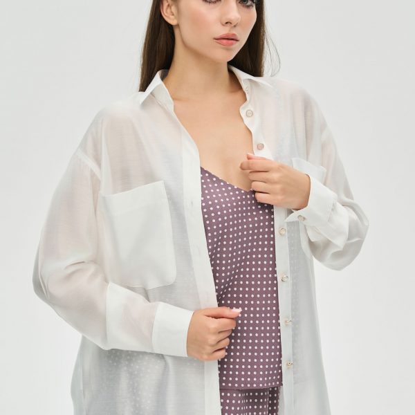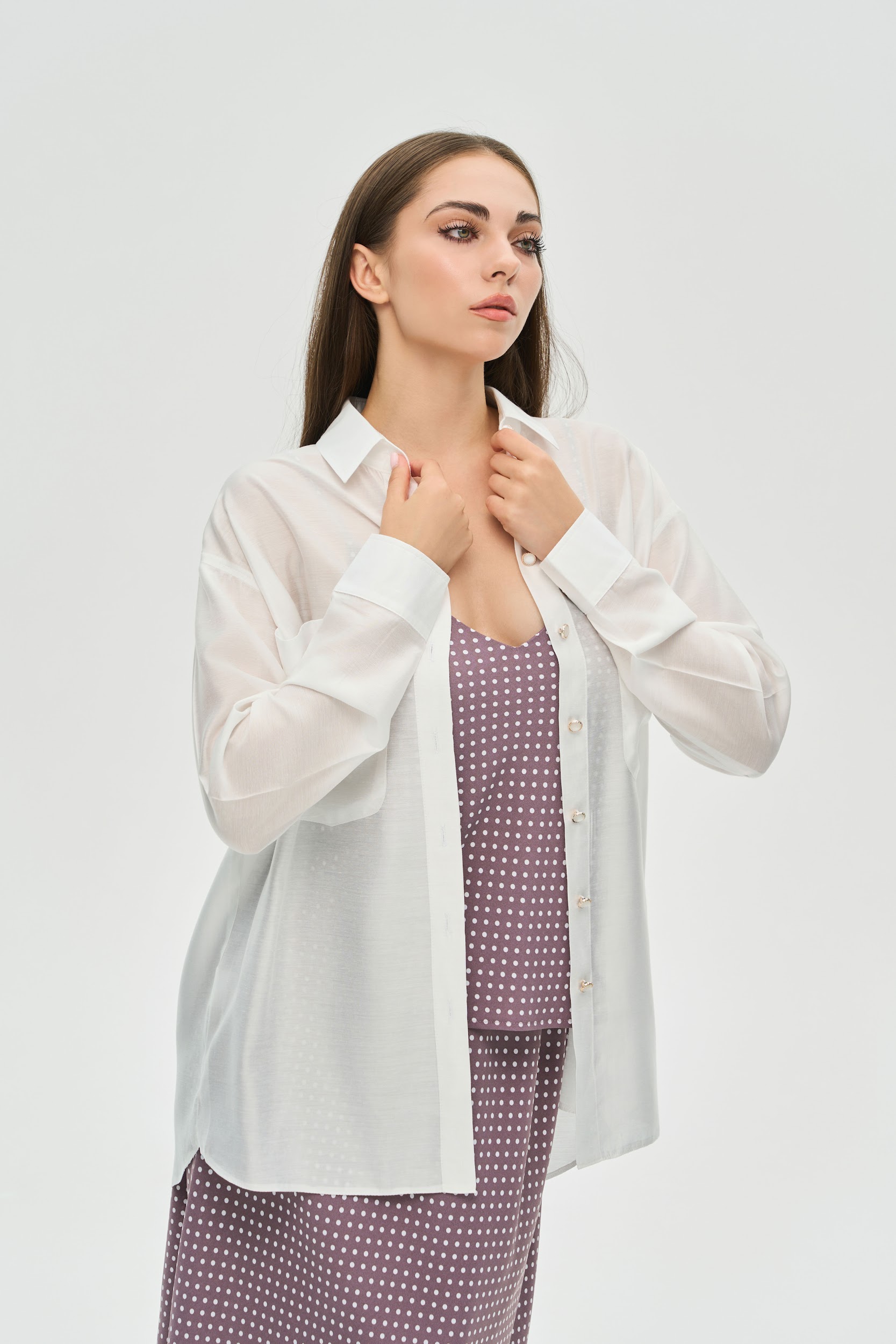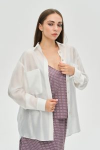 Мастхэв современного гардероба и синоним расслабленного стиля — наша новая рубашка свободного кроя. Невесомая, полупрозрачная и невероятно универсальная, она создана, чтобы стать вашим любимым спутником в теплое время года и добавить элегантной небрежности любому образу.