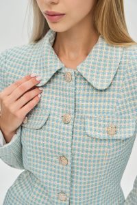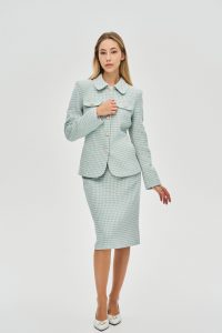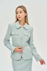 - Силуэт: Безупречный приталенный крой со структурной линией плеча и слегка скругленными полами идеально моделирует фигуру, создавая утонченный женственный силуэт.