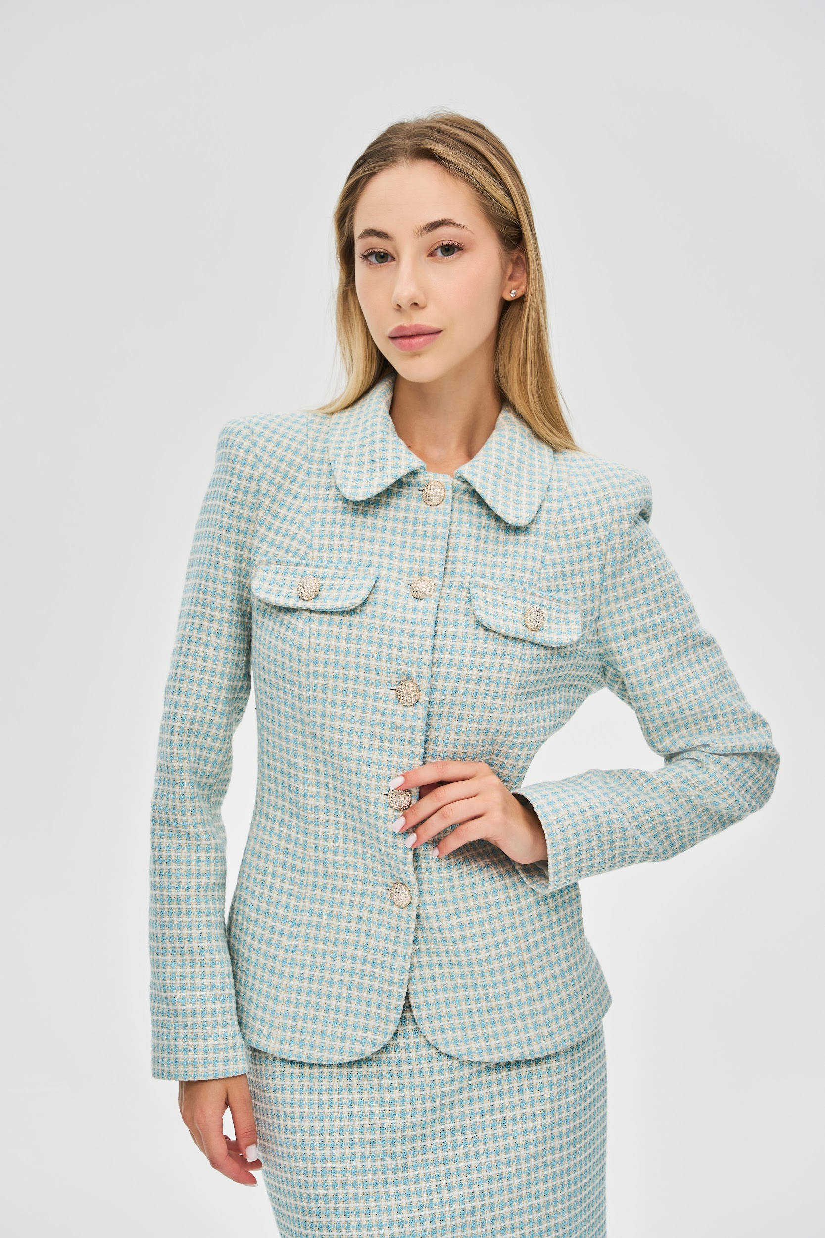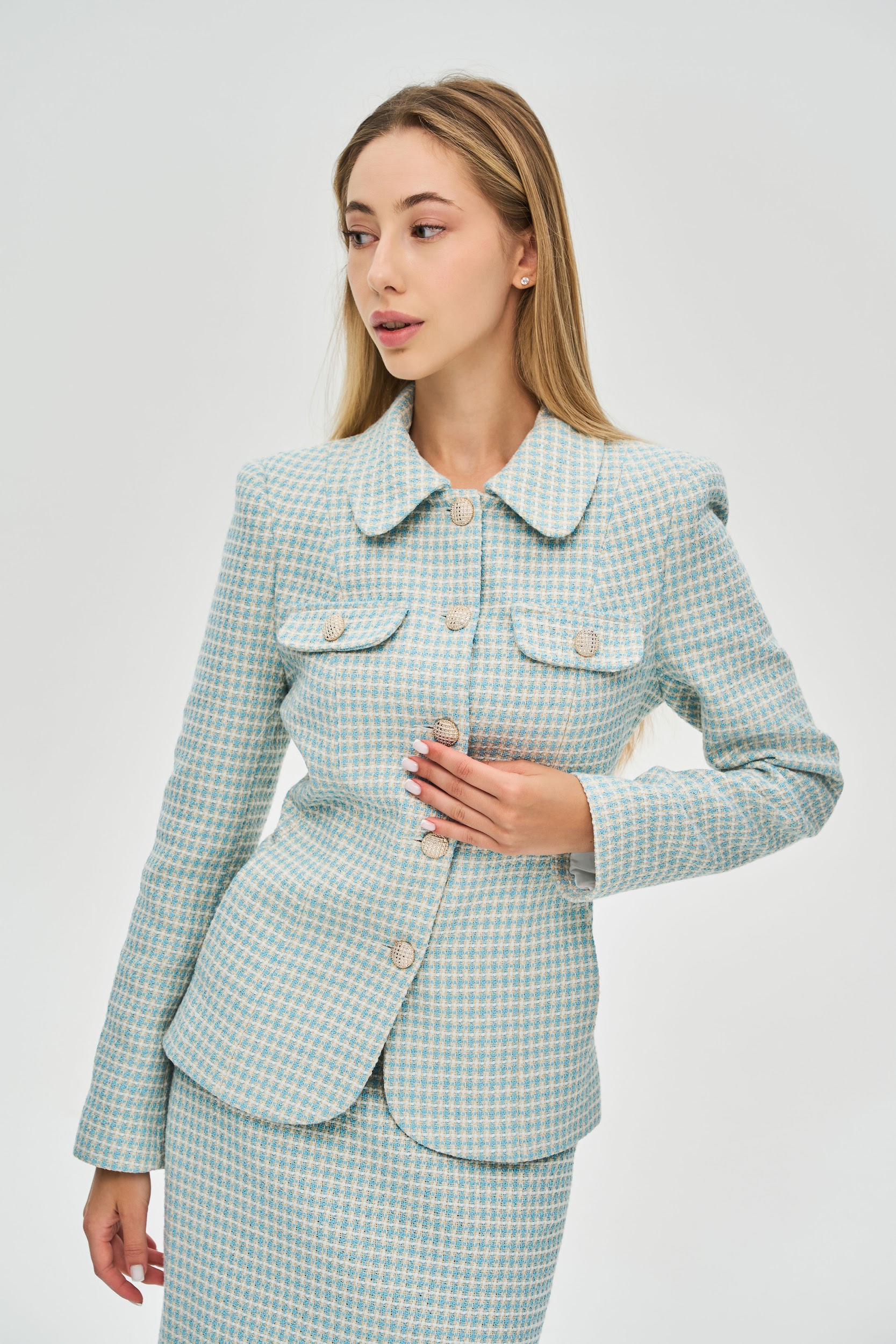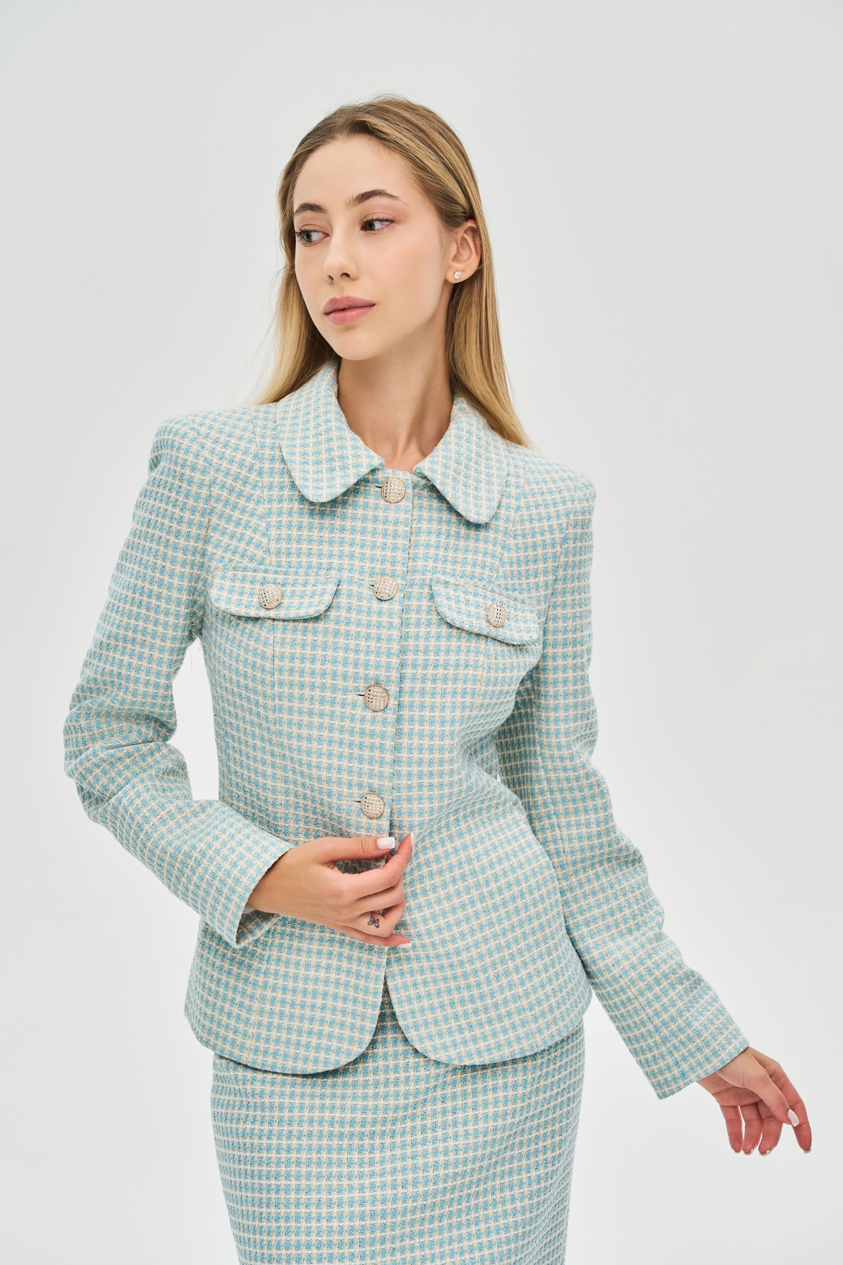 Соберите идеальный костюм: Для создания иконического и завершенного образа рекомендуем сочетать жакет с юбкой-карандаш из идентичной ткани, которая продается отдельно.