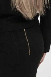 - Ткань: Выполнена из классического фактурного твида, который хорошо держит форму, не деформируется и подчеркивает достоинства фигуры.