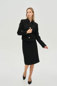 - Силуэт: Прямой укороченный крой с выраженной линией плеча и идеальной посадкой по фигуре.
