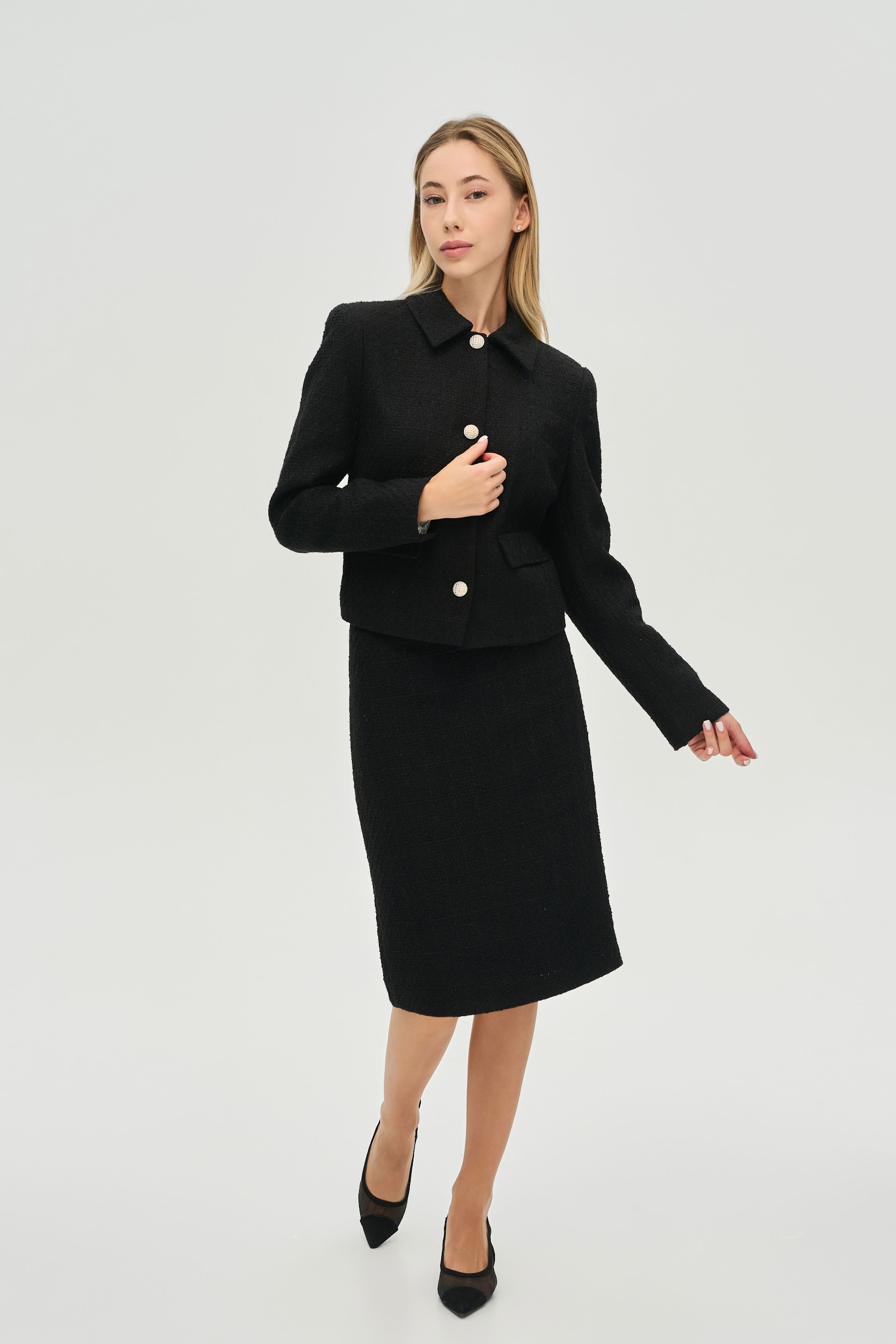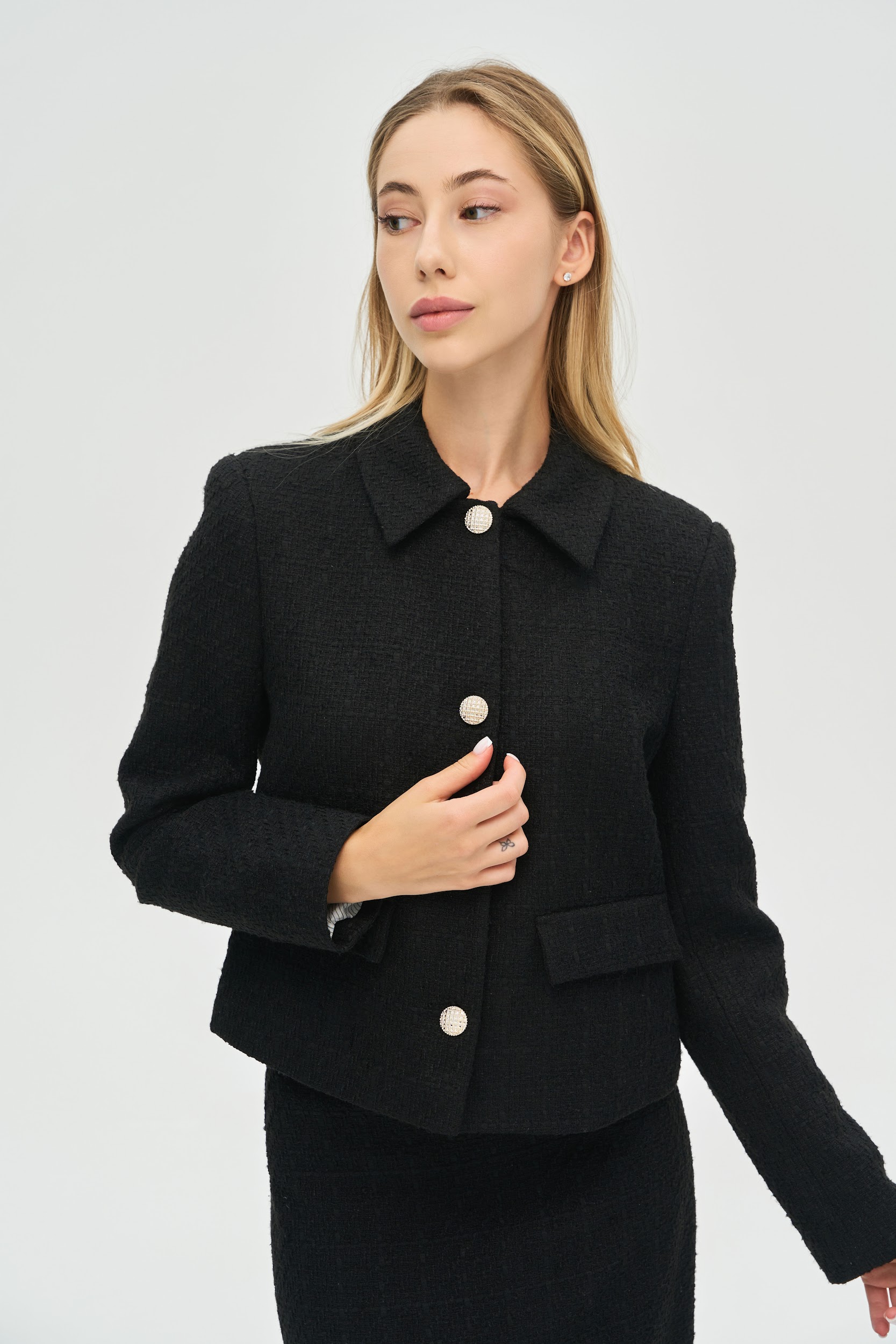 Соберите идеальный костюм: Для создания иконического образа рекомендуем сочетать жакет с юбкой-карандаш из идентичной ткани, которая продается отдельно на нашем сайте.