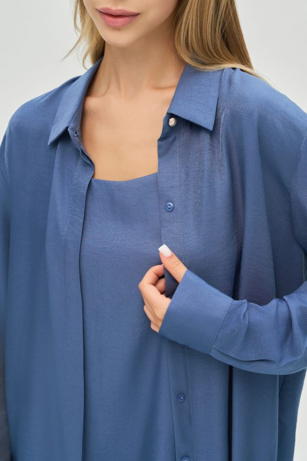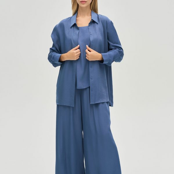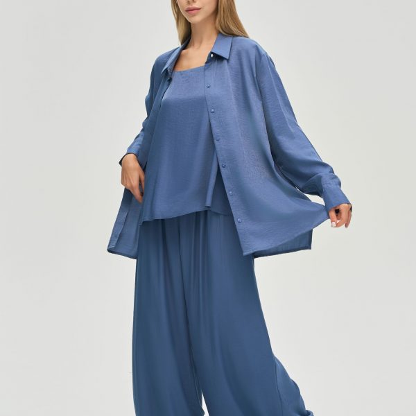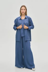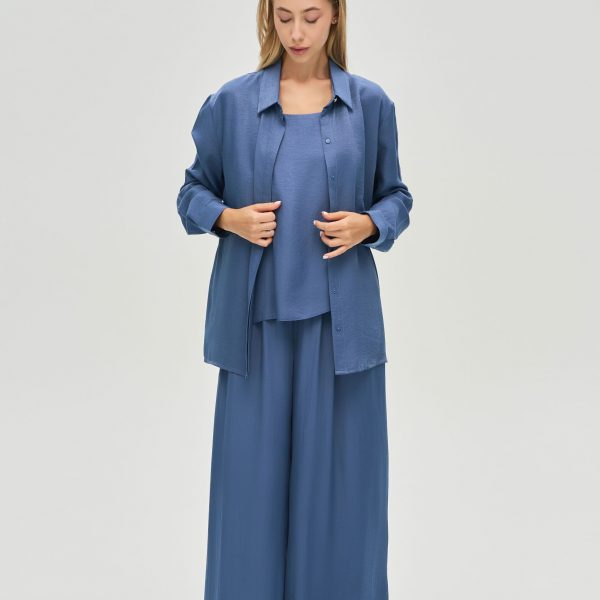 Соберите идеальный костюм: Эта рубашка является идеальным дополнением к нашему костюму, состоящему из топа и широких брюк из идентичной ткани. Вместе они создают роскошный и невероятно стильный монохромный образ.
